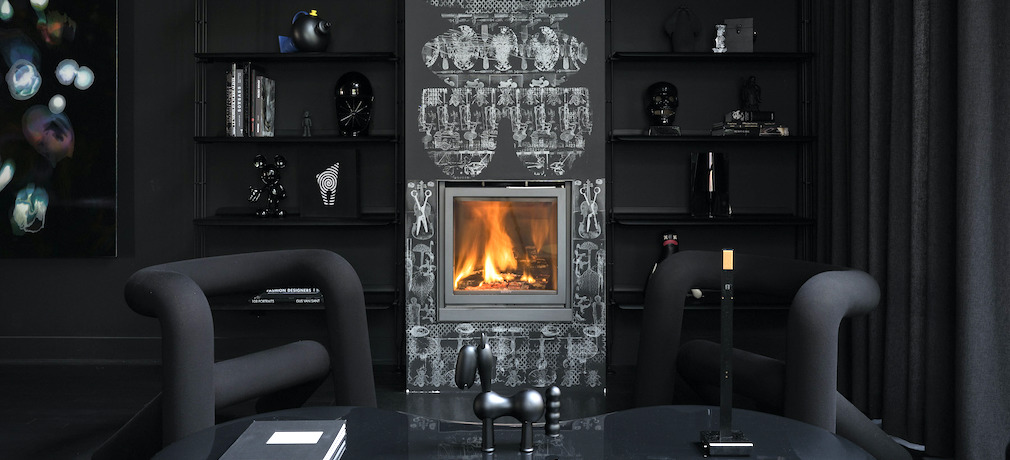 The fireplace is the canvas for a piece created on site by Morelli in the tradition of home wall drawing. For this work, called La nuit, tous les chats sont gris, five images were produced and translated using stamps to complete images already existing in Morelli’s work. The mural, the first to be printed on black support, inspired a series on canvas called Les grandes eaux nocturnes, which is available at the Chiguer Art Contemporain gallery.
