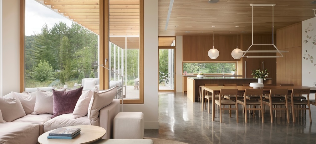 If the plan is the home’s organizational logic, light is its animating force. A large ridgeline skylight bridges the living and dining spaces, washing the cedar-finished interiors and vaulted ceilings in a diffuse, even glow that shifts with the weather and the hour. Combined with the floor-to-ceiling cedar-framed glazing that opens the main rooms to the garden, the interior feels luminous even on the most grey of coastal days.