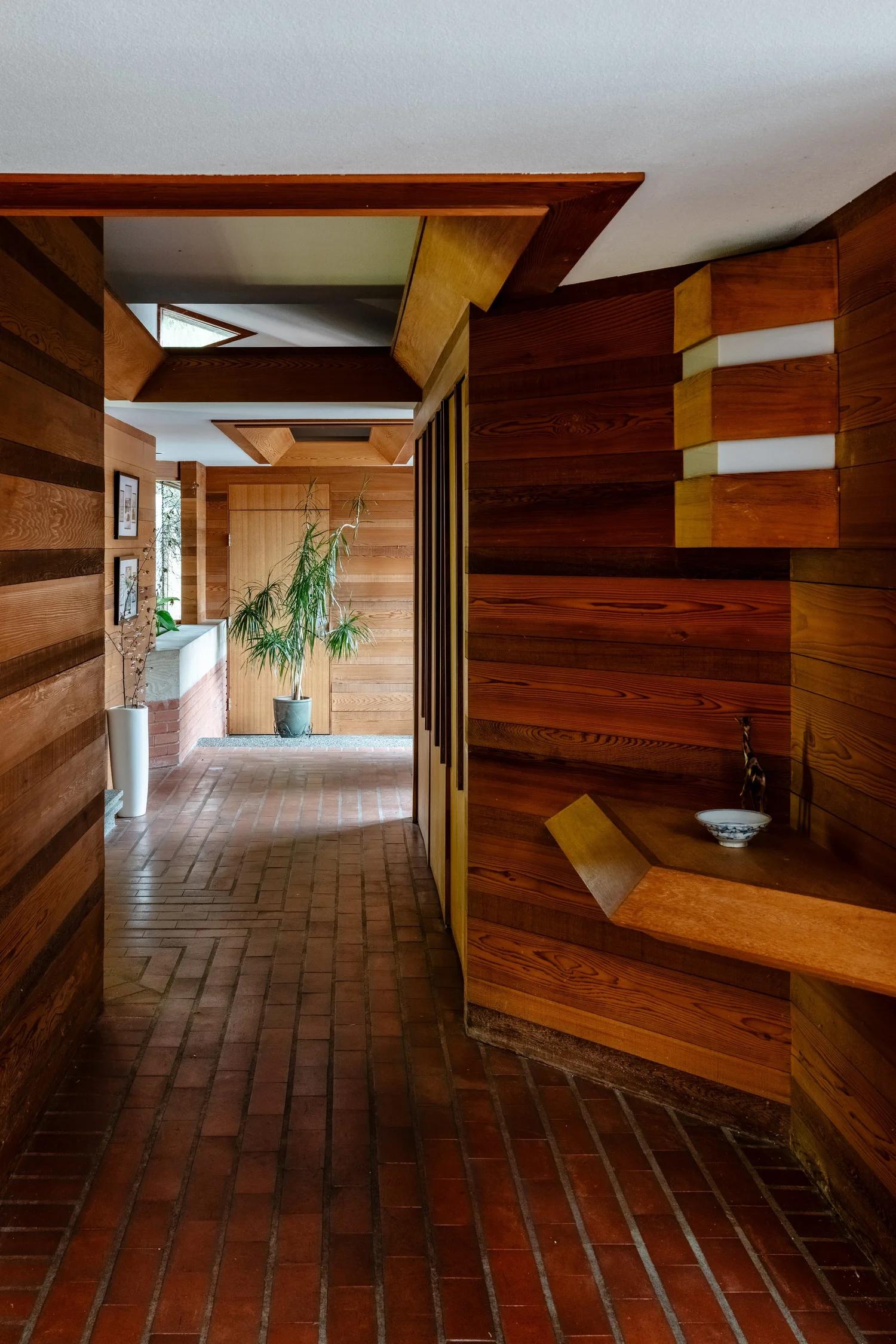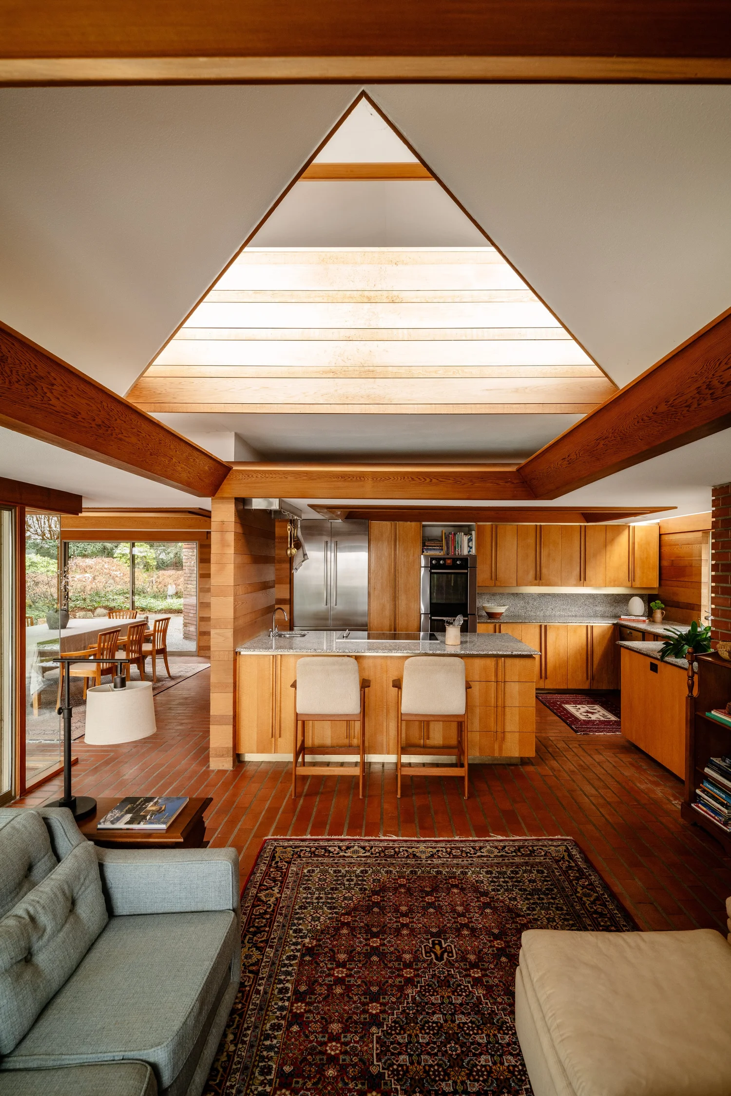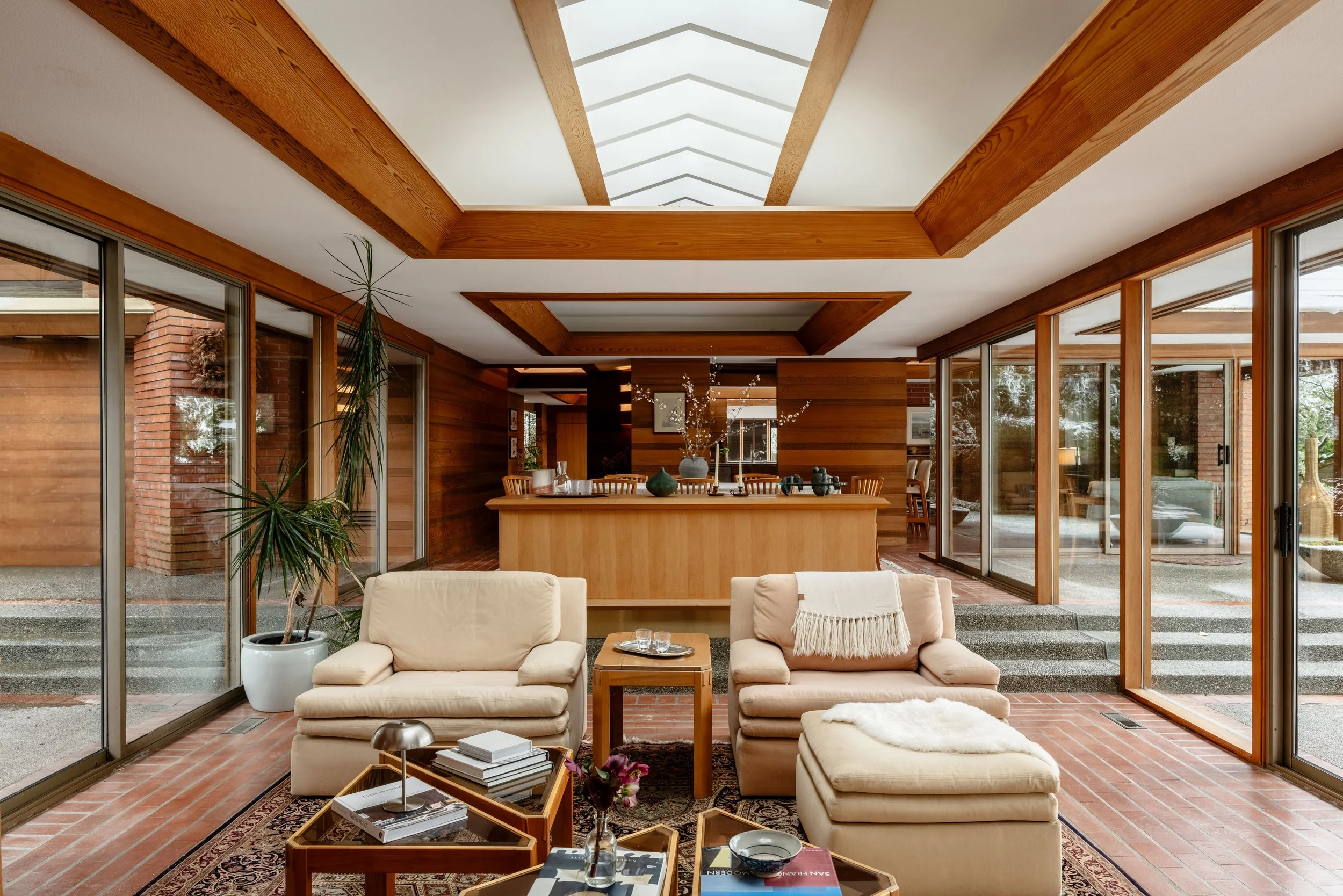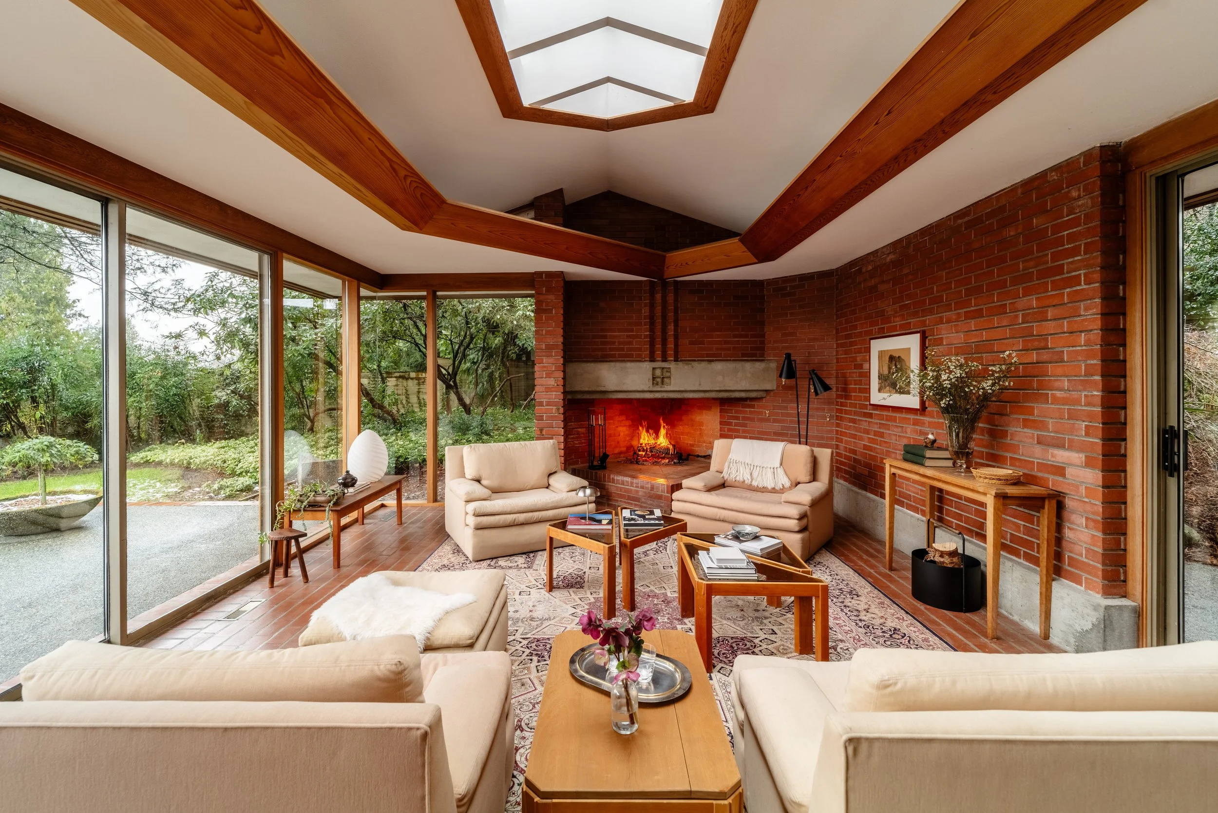 Hollingsworth believed that a building material should be expressed for what it is, never disguised or embellished. At the Lakeside House, this conviction is legible in every surface. Exterior walls are clad in local western red cedar siding of two alternating widths, paired with masonry sourced from Medicine Hat, Alberta. Its deep clay-red is a grounding presence against the tree canopy. Large expanses of glazing introduce a contrasting lightness, dissolving the boundary between inside and out. Together, these elements give the house an earthy yet weightless quality that sets it apart from a conventional Wrightian composition, lending it a character that feels unmistakably of the West Coast.