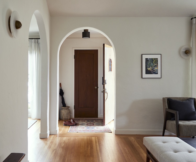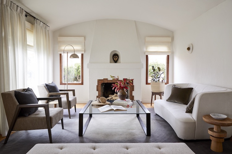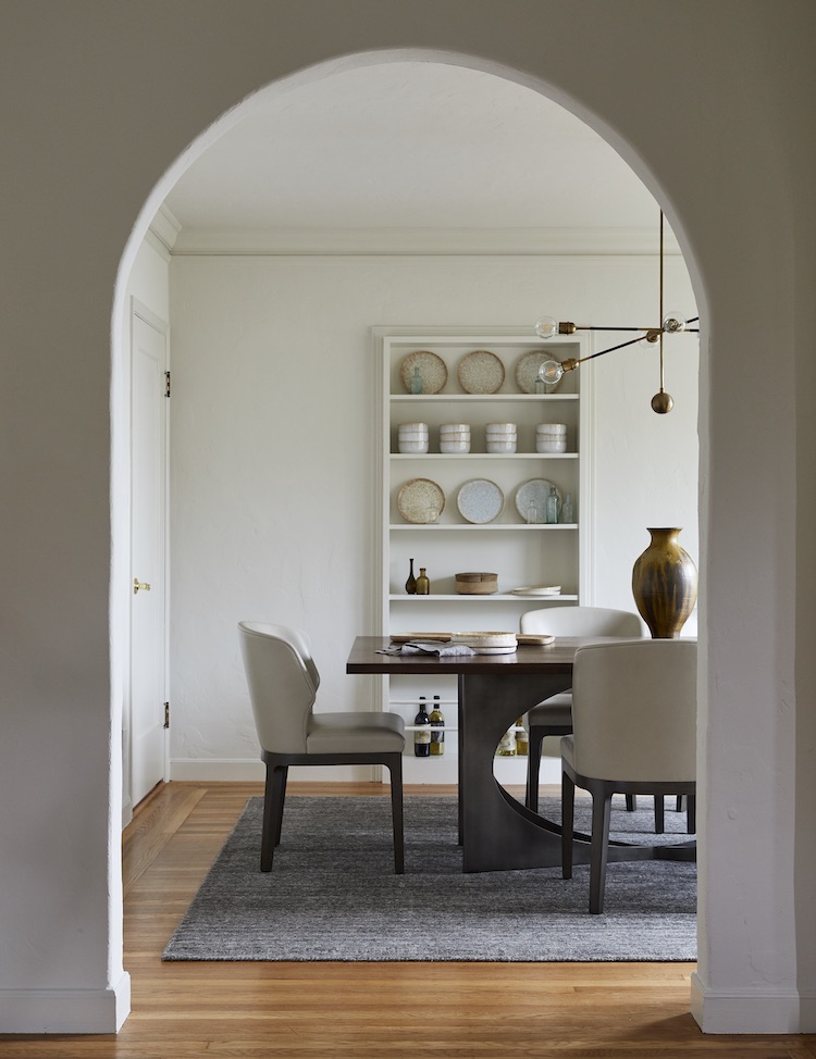 Naturally, compromises had to be made. While the client originally envisioned a larger sofa for the living room, he acquiesced to a more diminutive one that would meet the deadline. Its curvaceous lines reflect the home’s arches while beautifully juxtaposing the linear furnishings.