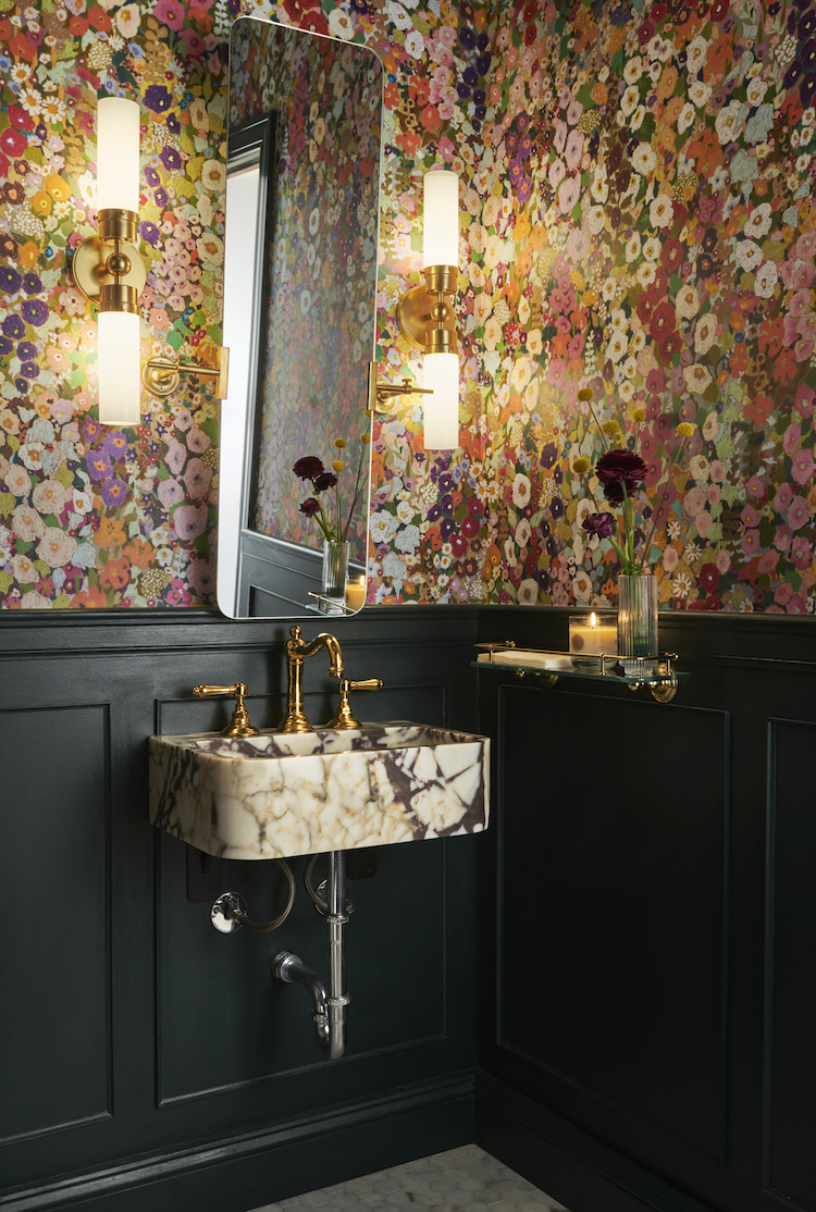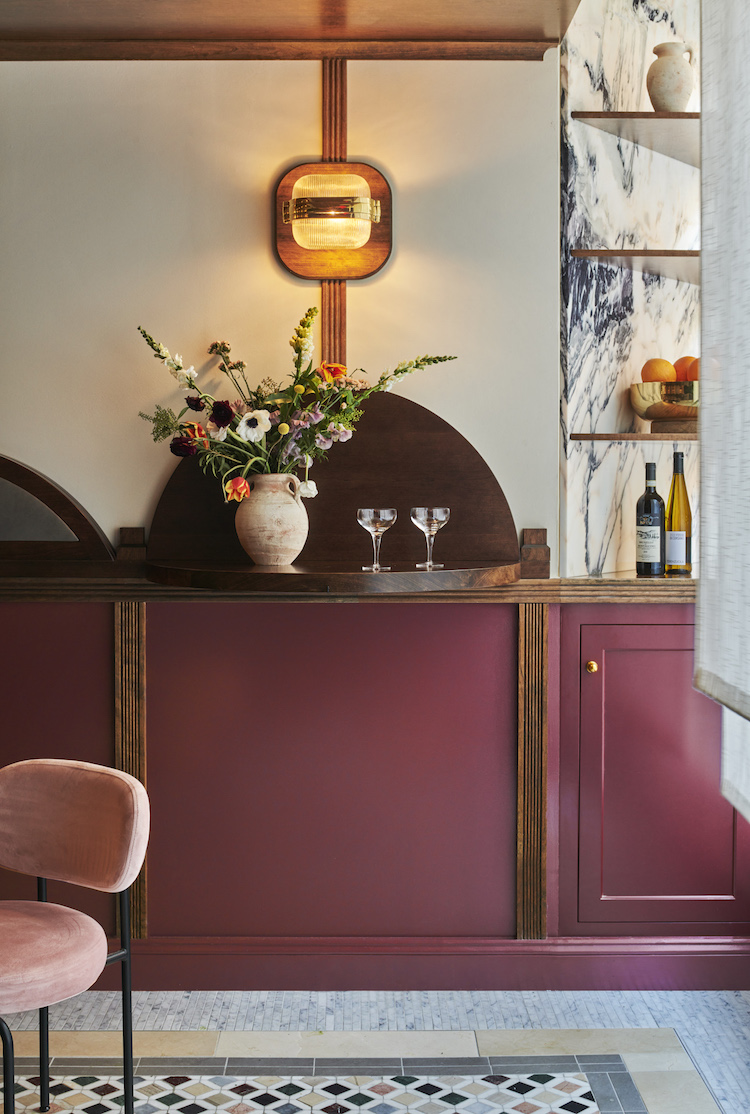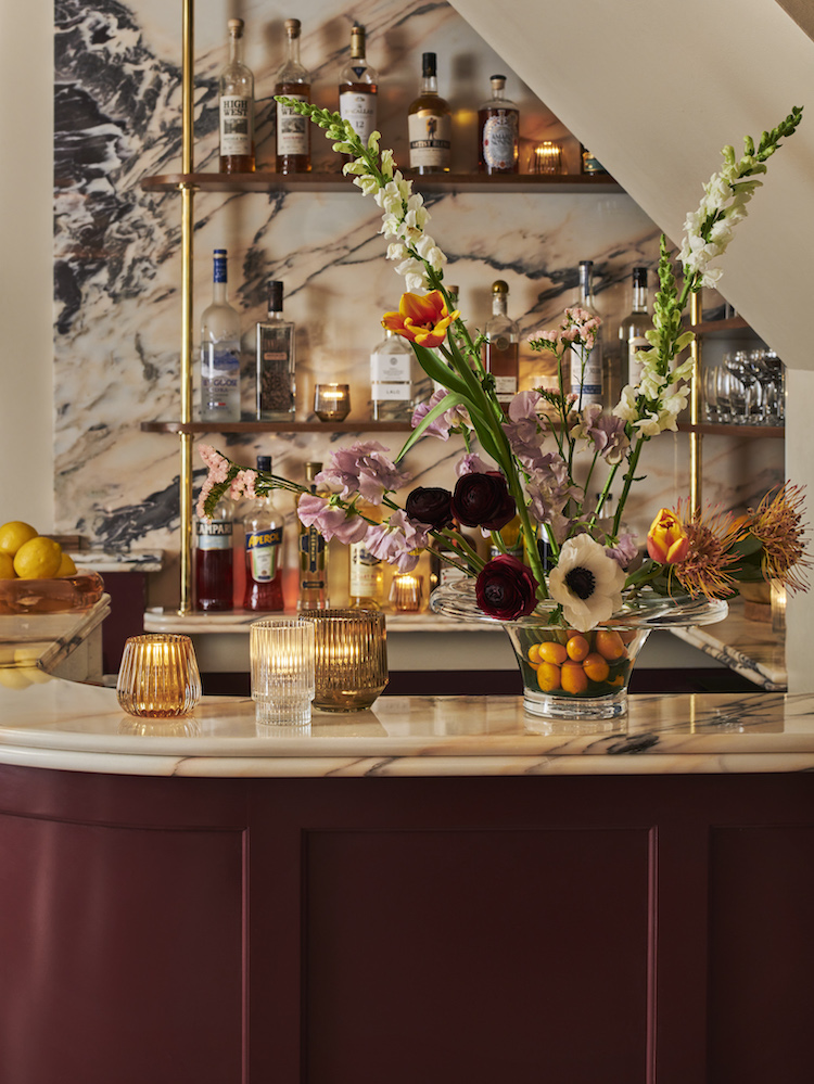 And just as a train trip across Europe might pass through multiple countries, Bolognino sought inspiration from a variety of sources. The art includes paintings that she calls out for having the quality of light of the Old Dutch Masters, and there is a stunning blood orange mosaic by Ukrainian artisans. Elements such as custom tiles in a variety of soft colors and brass bar accents call to mind Italy. Meanwhile, Bolognino calls the wine-colored wainscotting a nod to the tastes of young people today.