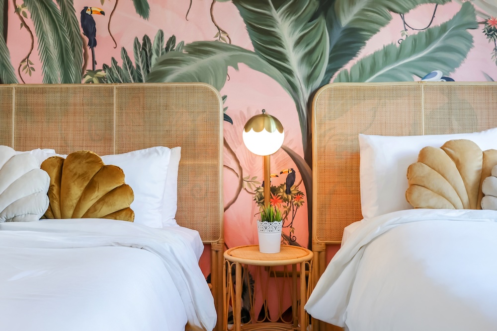 54 guest rooms occupy seven floors, with a color scheme that features shades of mint green, flamingo pink, ocean blue and vintage cream. Original tiling and terrazzo floors; artful wallpapers with tropical-inspired motifs; rich velvets; crystal chandeliers, lighting and geometry all nod to 1930s craftsmanship.