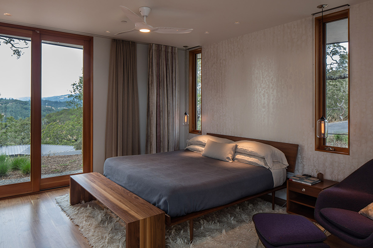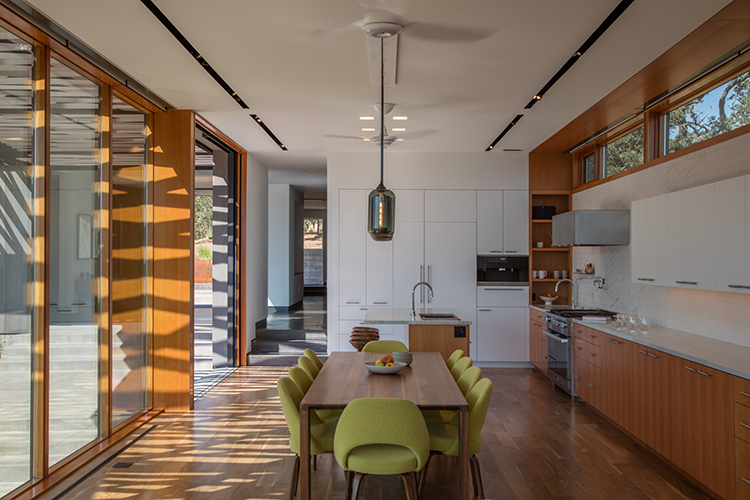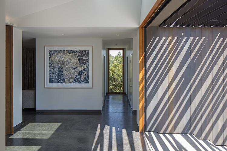 Key among those was creating a dual perspective of the house. Upon arrival, the house is tucked into the hillside, low slung and blending into the ridge lines with its cedar siding stained a lovely gray and understated windows. But upon entering the home a magnificent view unfolds of hills, valleys and oaks. Schwartz reflects, “We wanted to preserve and intensify that sense of arrival on the site.”