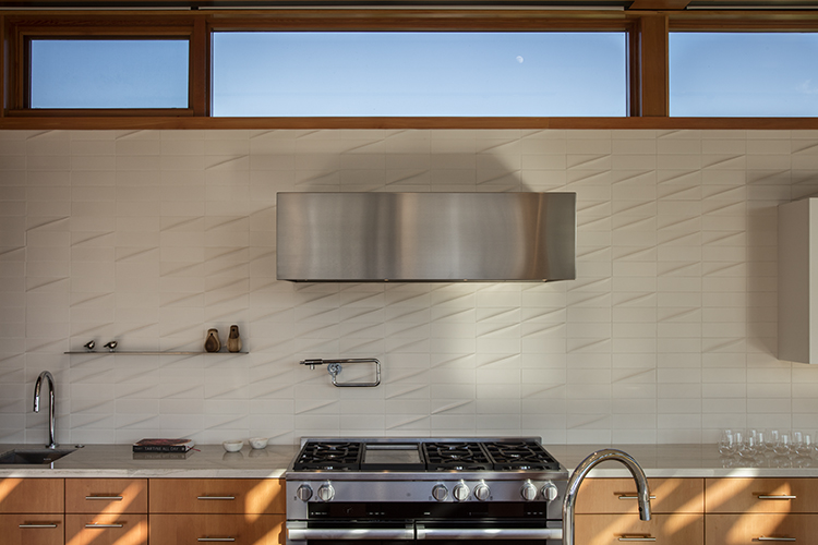 This architectural element is not only functional, its shadows create an ever-changing landscape, a ripple and sway that is emulated throughout the house in other mediums and features, such as the kitchen tiles and draperies. The home’s colors of green and tan (what Schwartz deems “licheny”) also complement the outdoor beauty.