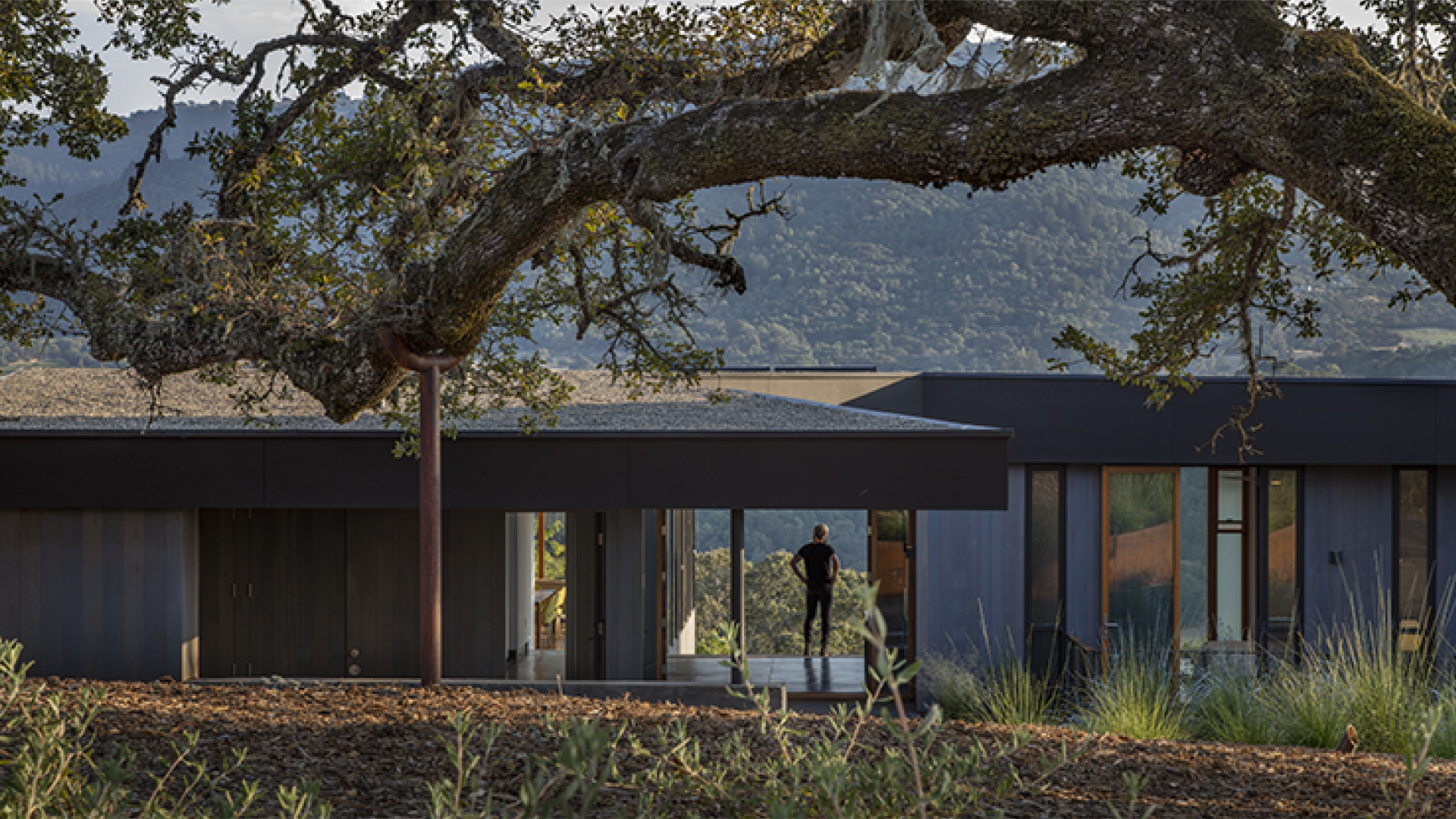 Atop the rolling hills of California’s Sonoma County lies a home inspired by its environment. From the grandeur of a miles-wide view down to the intricate pattern of a lace-like moss growing off oak trees, The Lichen House embraces this site.