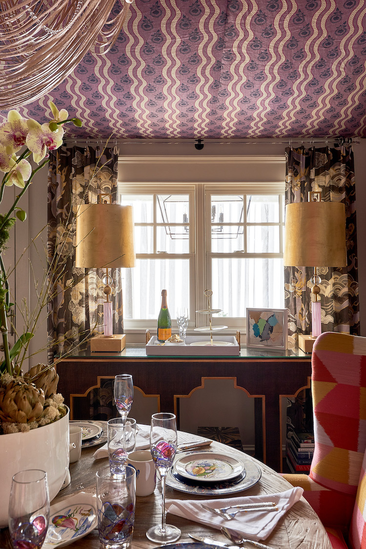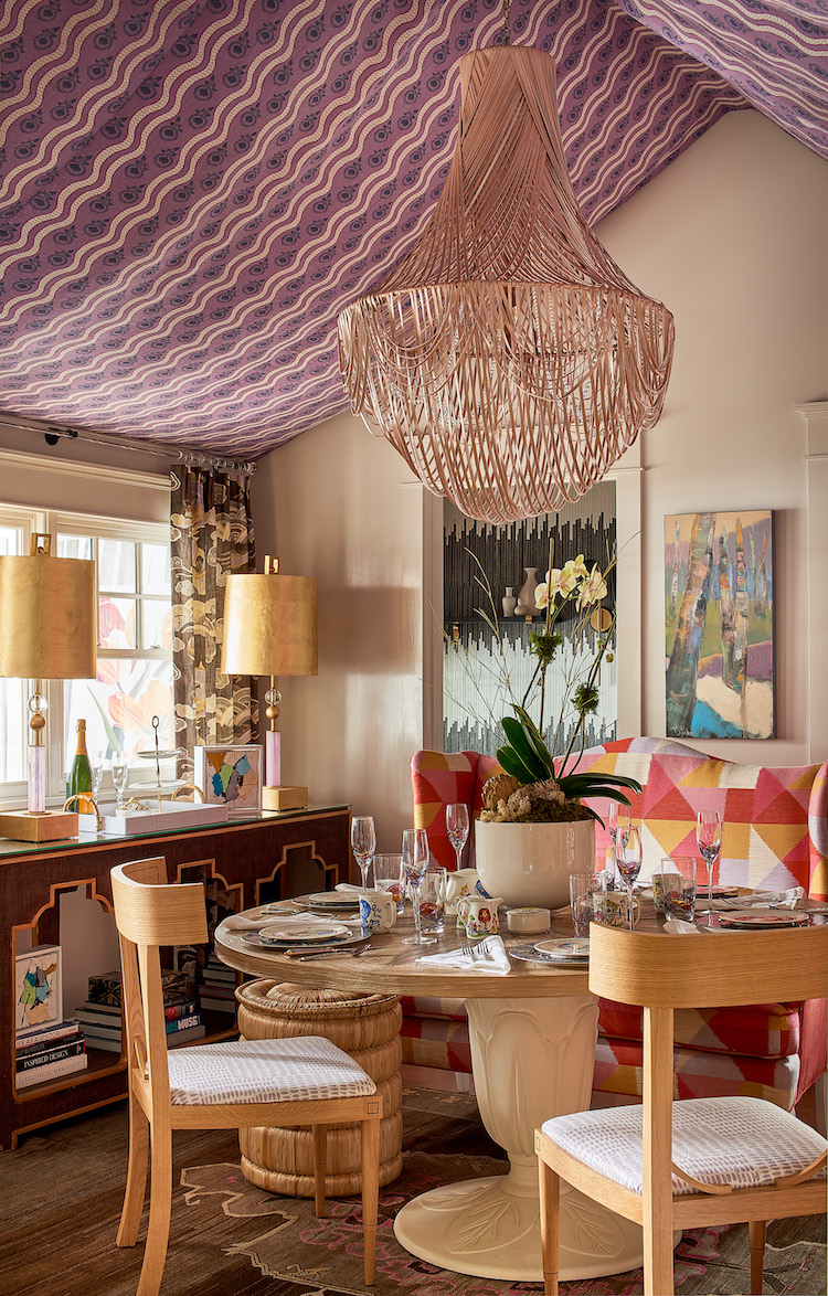 The Breakfast Room is a sophisticated, inviting space for everyday dining. The designers used the vaulted ceiling to create a whimsical tented room with a wisteria Bailey and Griffin pattern from Duralee. A Ngala Trading hand-stripped leather chandelier hangs overhead. The print heavy fabrics and upholstered elements in warm lilac, golden yellow, and pops of watermelon blend with soft neutrals to ground the space.