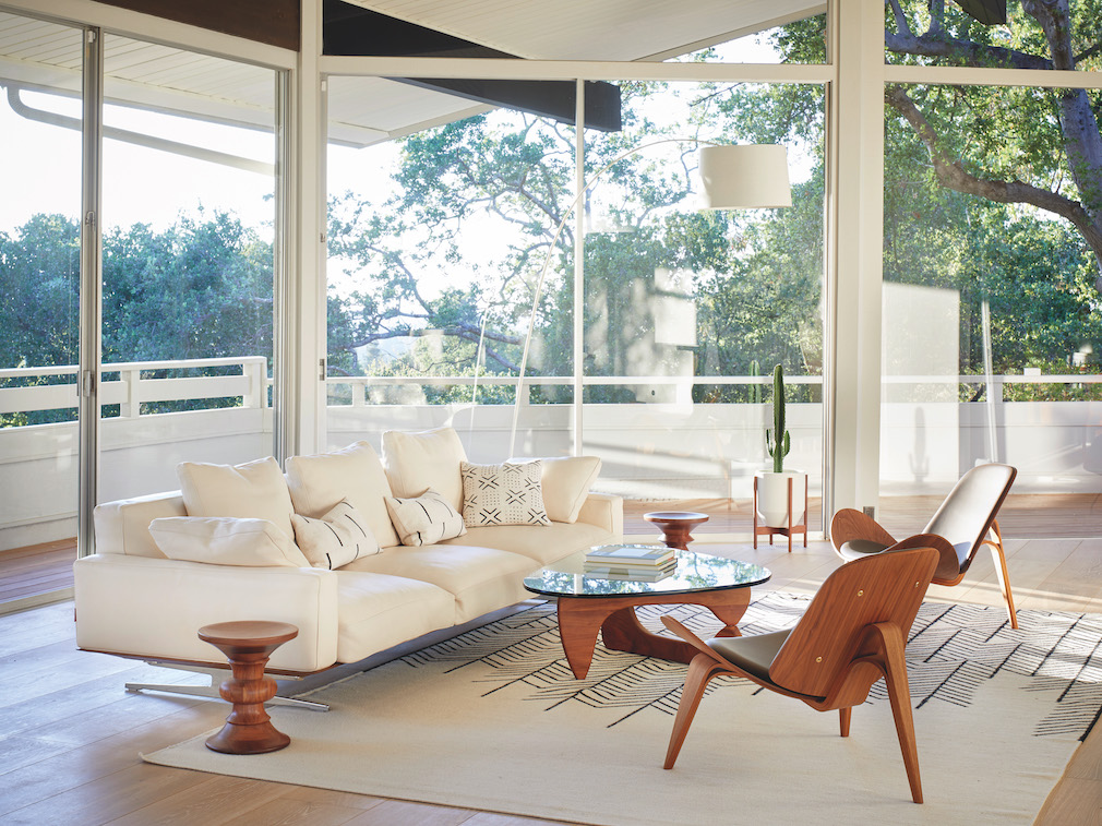 To create the light and airy feeling that she felt the house called for, Meier painted the walls in a light and welcoming warm gray tone—a big improvement over the avocado green that previously adorned the walls. The old wood floors, originally laid out in varying colors, were ripped out along with carpet dotted throughout the home—both replaced with large oak planks in a white-washed oil finish that opens everything up. In the living room, Meier added classic midcentury pieces such as Hans Wegner shell chairs and a Noguchi coffee table, balancing them out with more contemporary designs such as a sleek Flexform sofa adorned with African mud cloth pillows, a Foscarini Twiggy lamp, and a leaf-like patterned rug that ties into the outdoors and the ceiling beams’ darker tones.