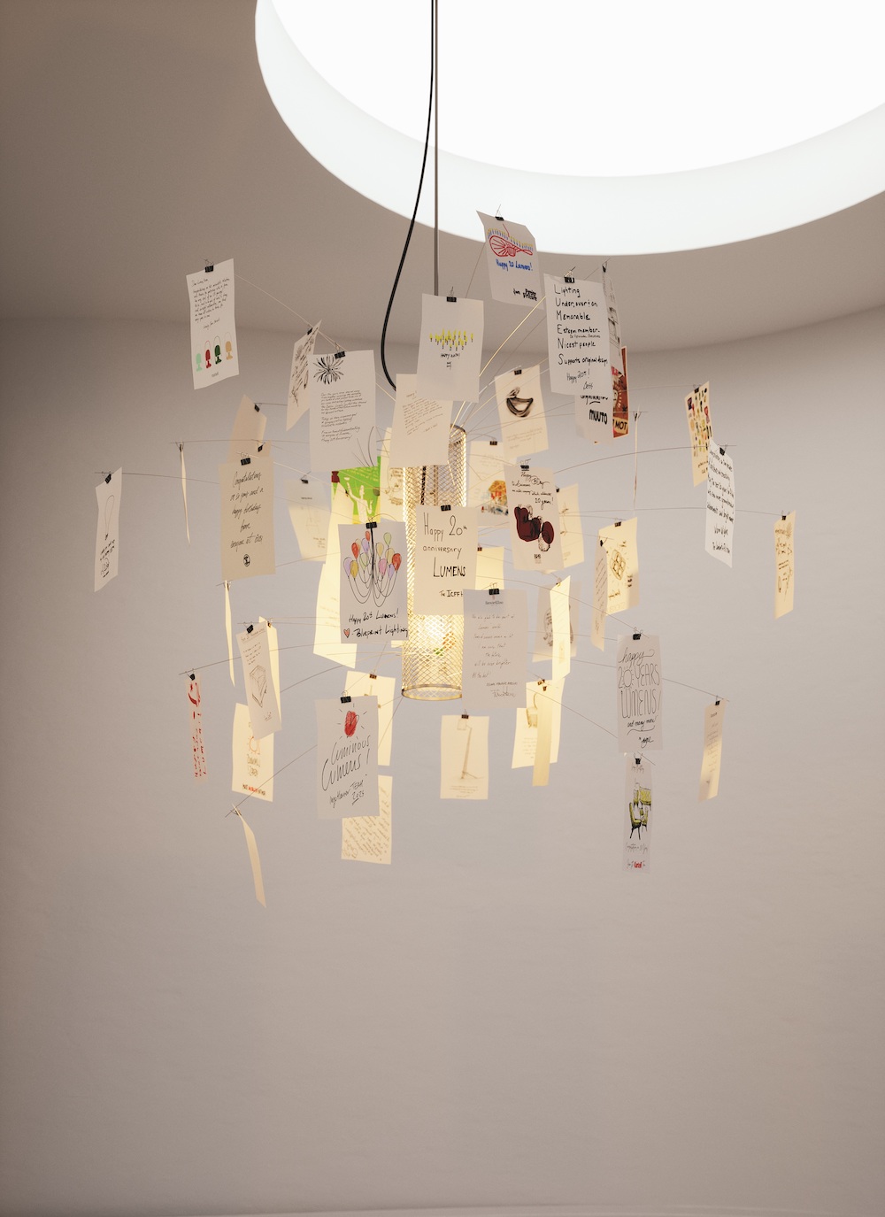 In recognition of this milestone, supporters of Lumens, including iconic brands, media, and members of the A+D community, created a collaborative work of art with personalized sketches, notes and illustrations, all united and displayed together on Ingo Maurer Zettel’z chandelier. Each of its 80 sheets of Japanese paper feature the personalized creations from designers, partners and friends of the brand, all clipped to the chandelier as thoughtful mementos of two decades of creative collaboration.