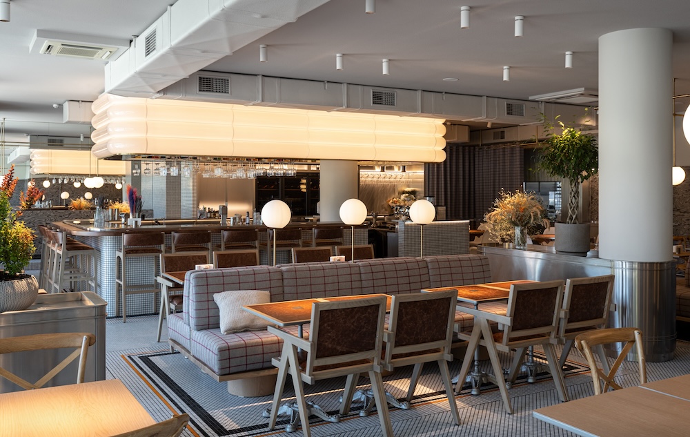 The restaurant’s focal point is a rounded bar, above which a massive lamp cap rises. It resembles ample meringue on a cake and works as a visual magnet of the interior. Through panoramic windows, the illuminated bar can be seen from the street and square opposite the restaurant, attracting new visitors.