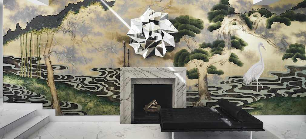 Designer Lynne Beyer added a 35-foot custom de Gournay mural across the living room wall, evoking the Asian galleries at the Metropolitan Museum of Art. Mirror: Christopher Guy. Chaise: Mies van der Rohe from the homeowner’s own collection.