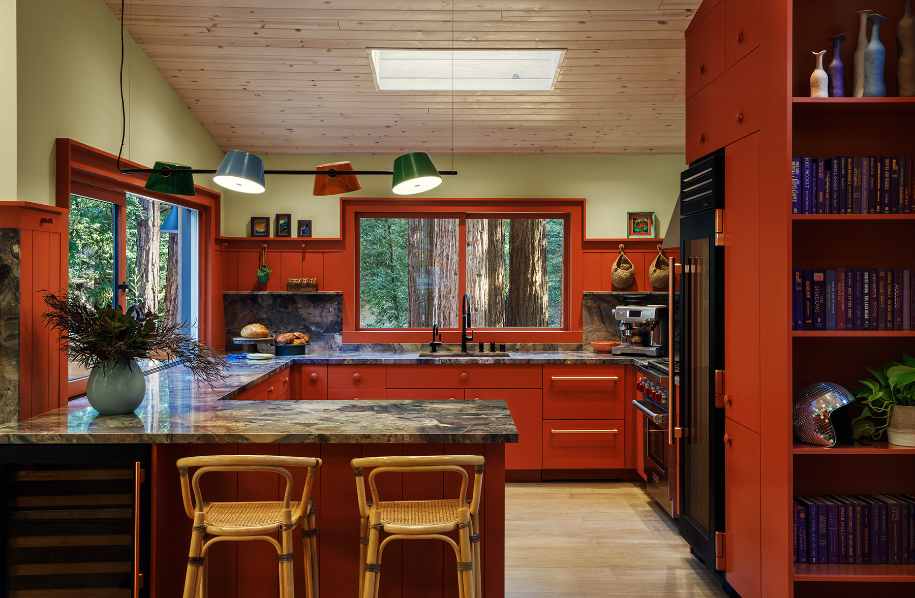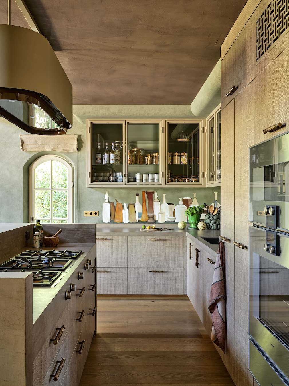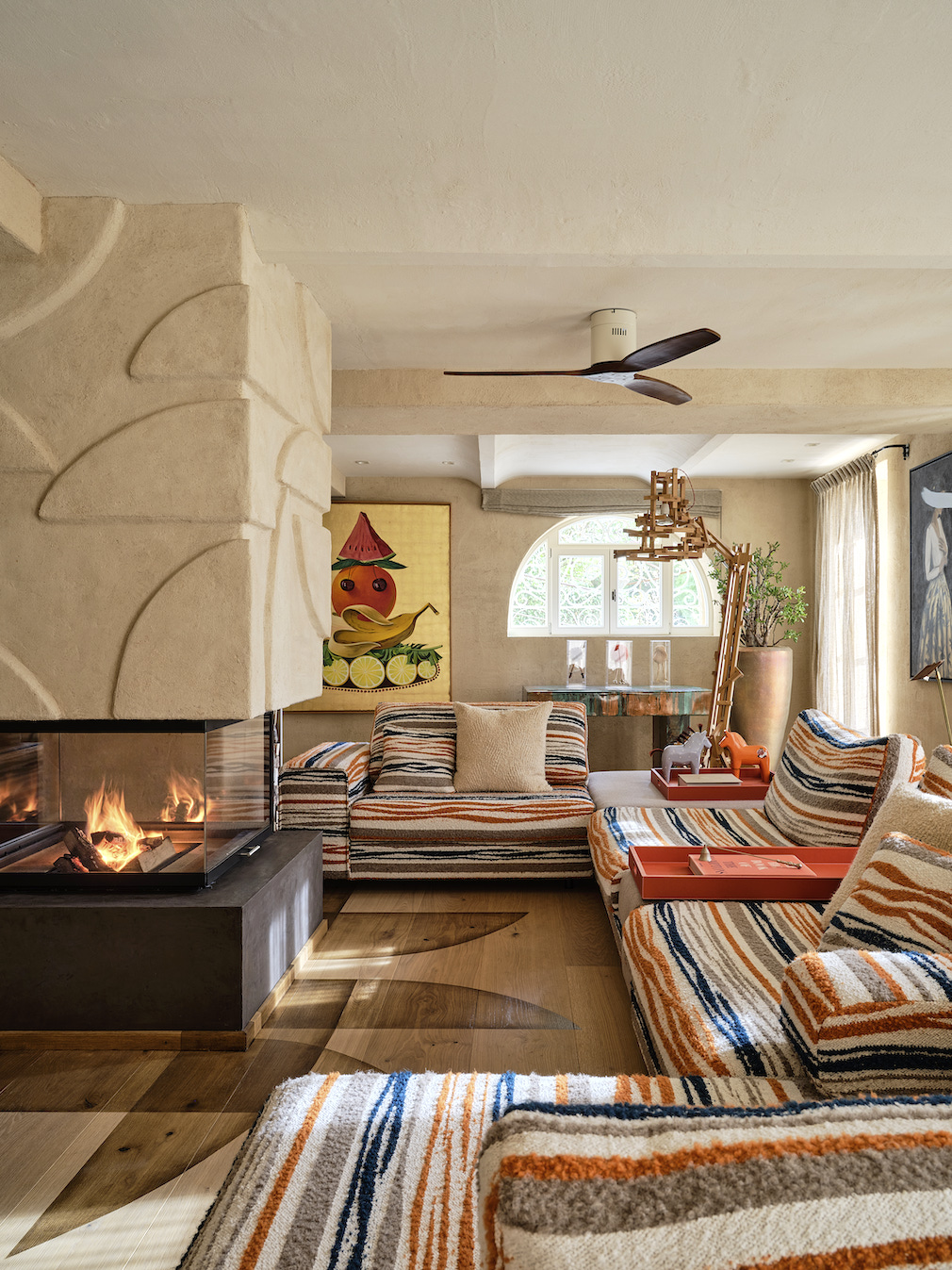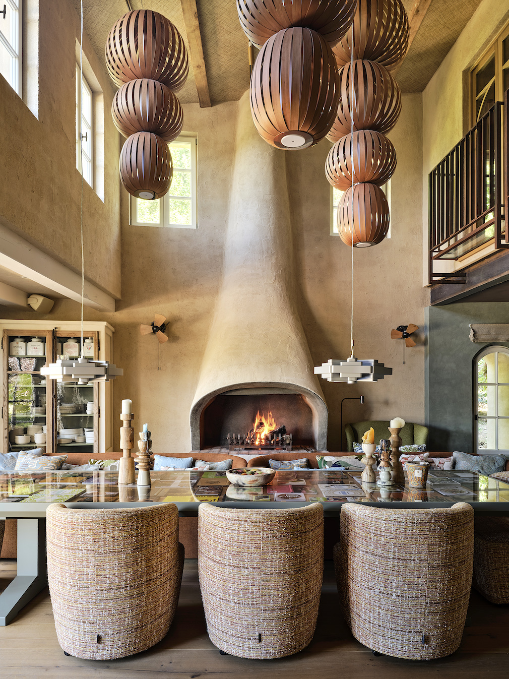 Oudshoorn Spaargaren designed an organic-form fireplace reminiscent of a kiva in the dining area and clad walls in earthen-colored plaster. “It suited the site,” she notes, pointing to the rolling hills covered with old-growth trees that surround the house. “I like a lot of light, but I never do white walls,” she explains. Windows on the first floor were converted to French doors to amplify the light and offer easy access to terraced gardens, an outdoor kitchen, a pool and lounging areas.