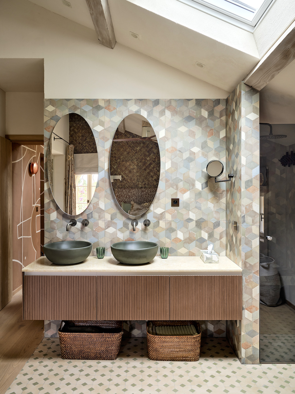 When they first renovated Mas des Sources in 1999, it was, she describes, “a cache-misère,” a French word loosely translated as “camouflage” and implying an attractive façade that conceals a dilapidated interior. Oudshoorn Spaargaren added two baths above the kitchen to give each room en suite conveniences, but other measures were primarily cosmetic. In 2023, however, the family discovered moisture damage behind stairs and walls due to groundwater that was, she states, “like a river running through the cache-misère.” A more radical renovation became necessary.
