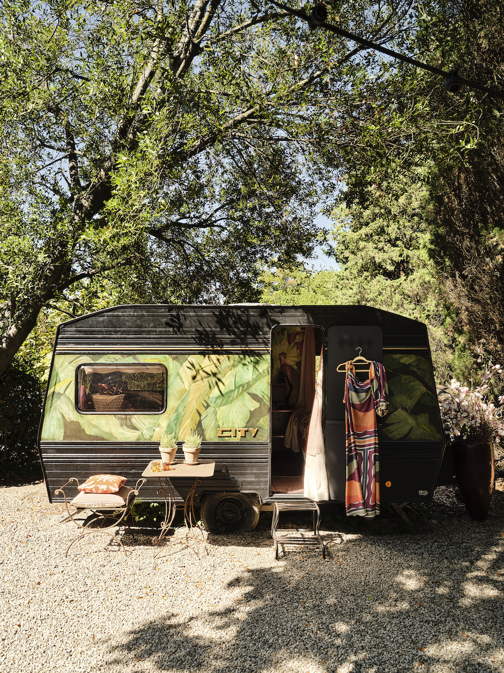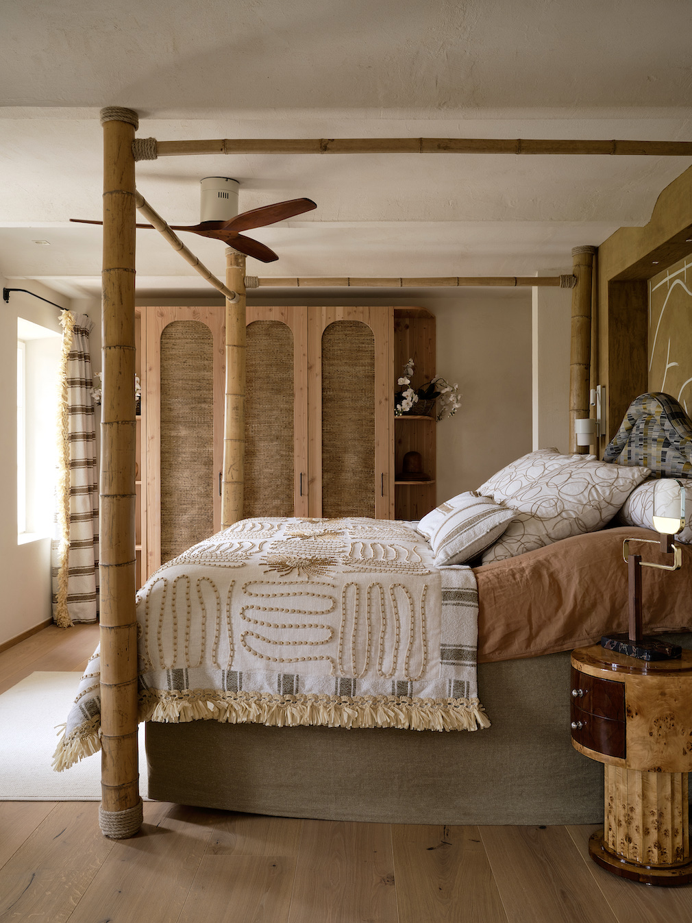 The designer removed a whole floor above the dining area to achieve an airier, double-height space. She also collapsed the nine bedrooms into seven and compensated for some of the diminished guest quarters with a two-bed trailer parked beneath the trees off the terraces outside the house. She also enlarged the kitchen and replaced cabinetry with MDF panels that had a rattan-like texture and made it “less Provençale” overall. Floors were also replaced using wide wood planking.