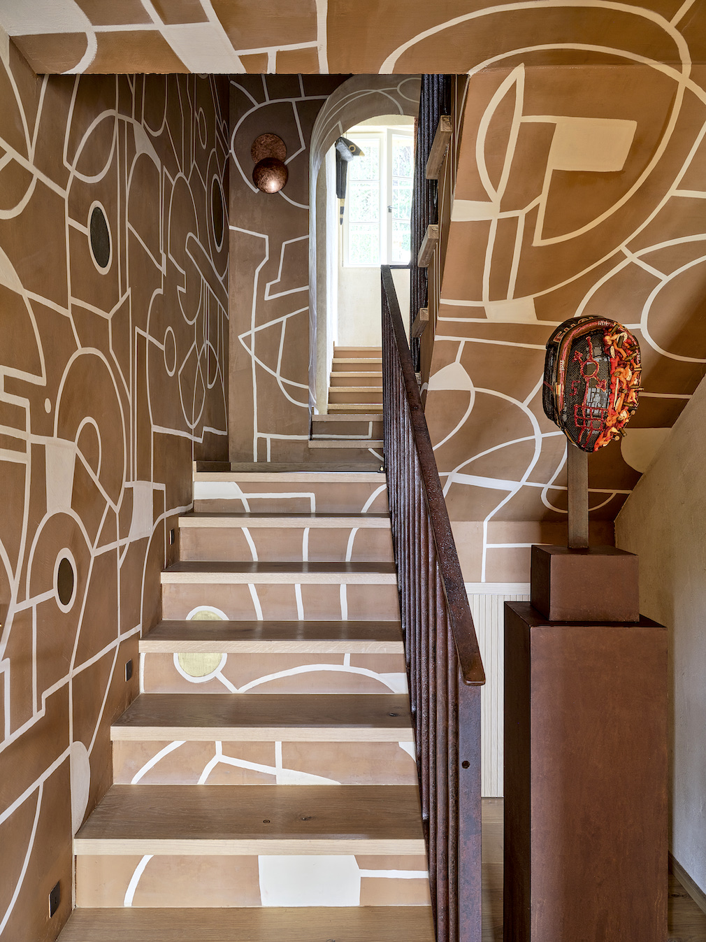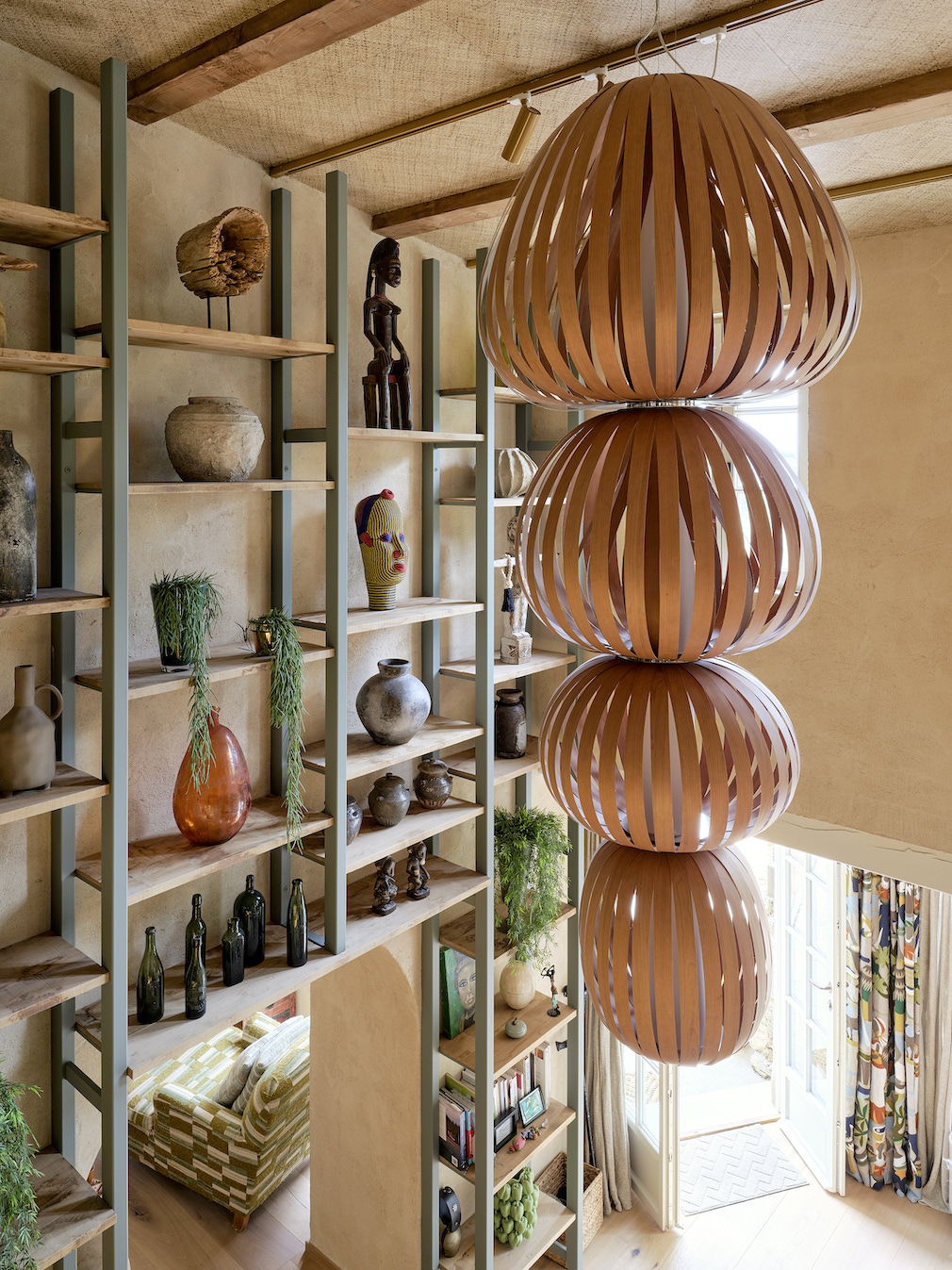 The revamped interiors became an exotic mix of global fabrics and artifacts. “I am a real lover of African and Indian cultures,” she shares. Textiles and artifacts reveal these predilections. But true to her world-traveler nature, they mingle with Cambodian sculpture, vases from Morocco, ironwork by local artisans, modern lighting by Moooi (living room) and LZF (massive Totem pendants over dining table), and murals reminiscent of Ndebele art from South Africa (enveloping a stairwell) and on a backsplash in the kitchen, the latter inspired by Giorgio Morandi’s still life paintings.