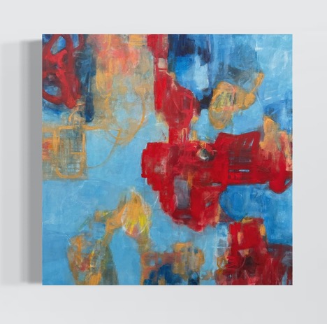 “Calliope” is another one of Anna’s oil and oil stick paintings. Rich bright reds are contrasted with scrubby blue and orange areas.