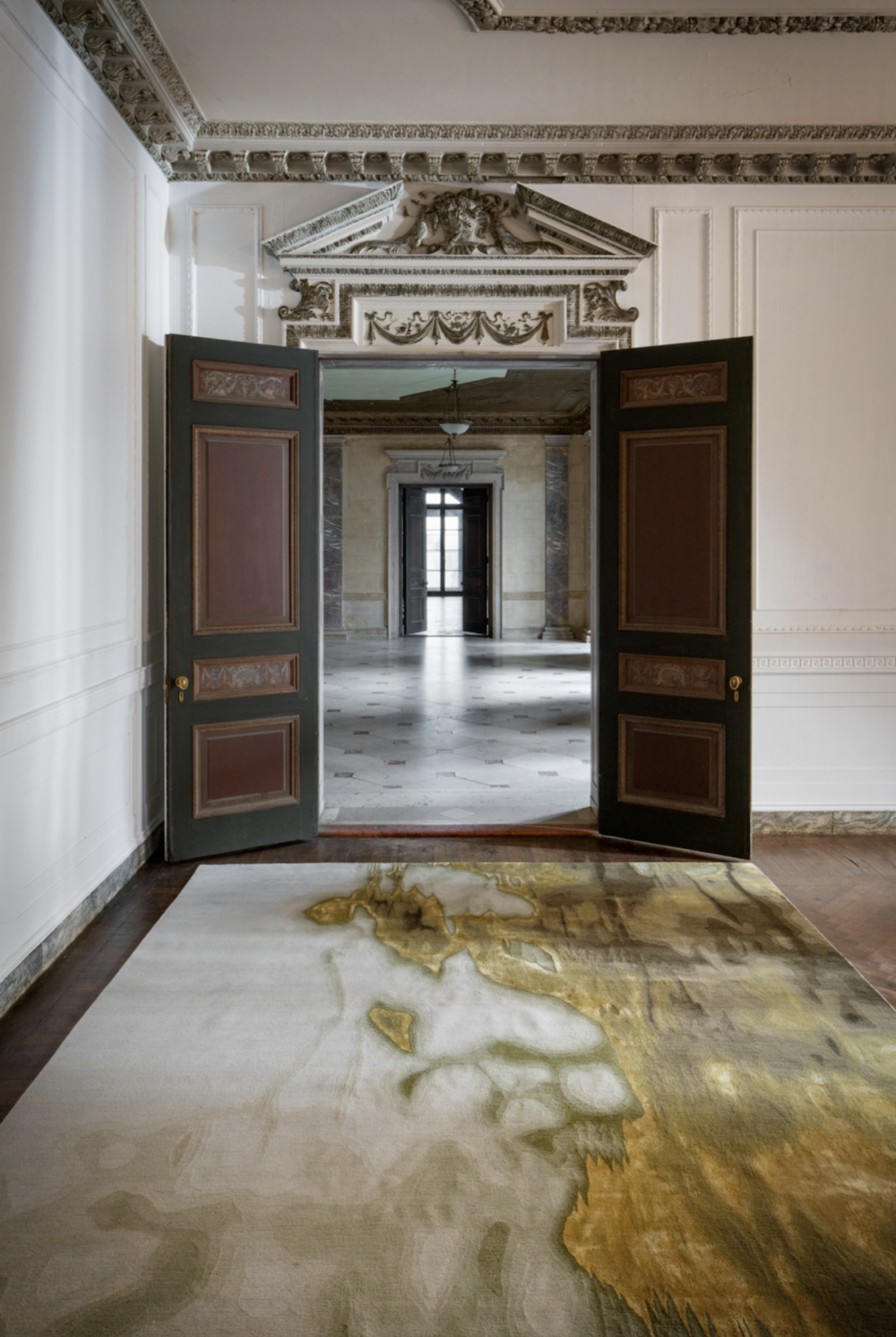 Schoal I: This ethereal hand tufted rug is part of the Tides Collection. This dreamlike creation is inspired by the shape and patterns formed by water.