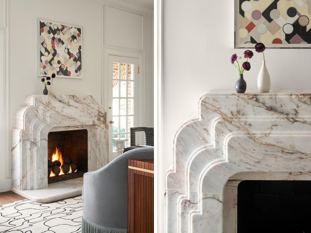 The Palais mantel channels old-world elegance with a wink, turning carved marble drapery into a moment of pure theatrical charm.
