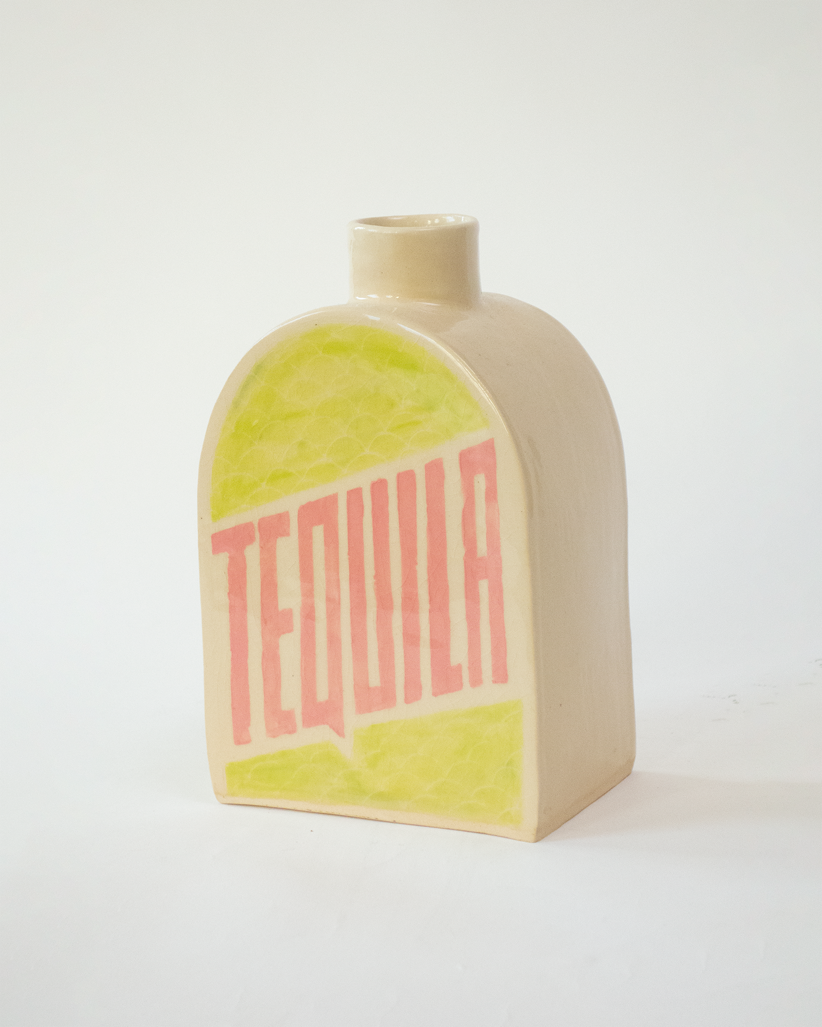 Tequila Tequila! 8.5” Decanter is a decorative piece made of white stoneware with hand-painted lettering and chartreuse wash.
