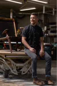 About the Maker | Justin founded Fernweh Woodworking in 2015 in Bend, OR. With this step into the unknown, he found his deep passion for design through woodworking, eventually specializing in furniture. He developed the Sling Chair and Tripod Table in 2017, and these designs sparked his desire to develop a full line of small-batch hand-crafted furniture. The Oxbend Collection arrived in 2020, rounding out the rest of the collection so that Fernweh Woodworking now offers furniture for every room in a house. A few of Justin’s design inspirations are Sam Maloof (particularly his passion, kindness, and work ethic); Hans Wegner (his practicality and purposeful creativity); and Finn Juhl (his pursuit of perfect curves and natural beauty). Justin studied business at Purdue University. After graduating, he joined the Marine Corps where he deployed on an advisory team working closely with Afghan Police. After moving to Oregon and joining a wildland fire Hotshot crew, he started Fernweh in the off-season from fire.