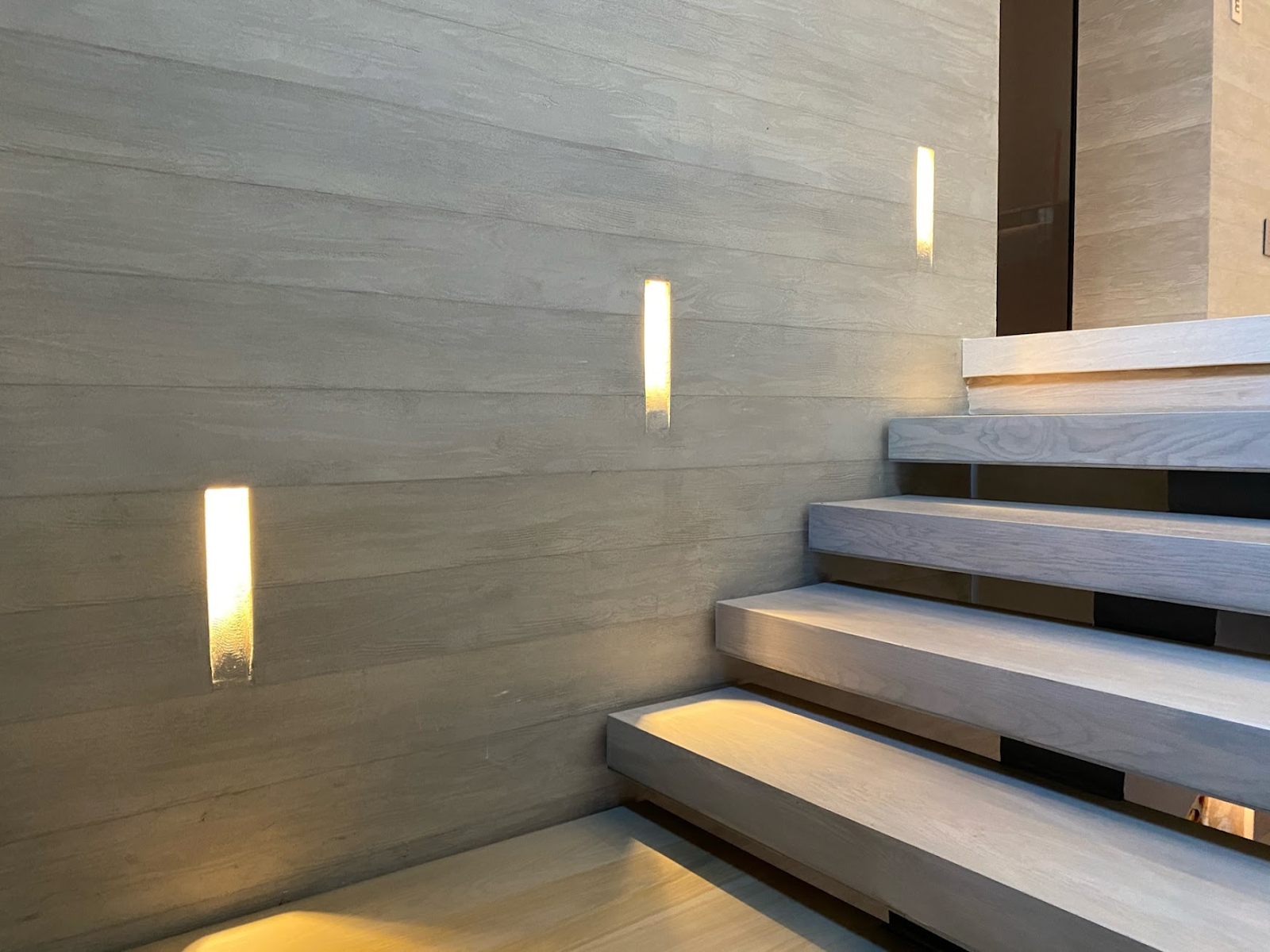 Recessed lighting subtly illuminates the textured wall and floating stairs, blending seamlessly into the architecture to create a serene and understated ambiance