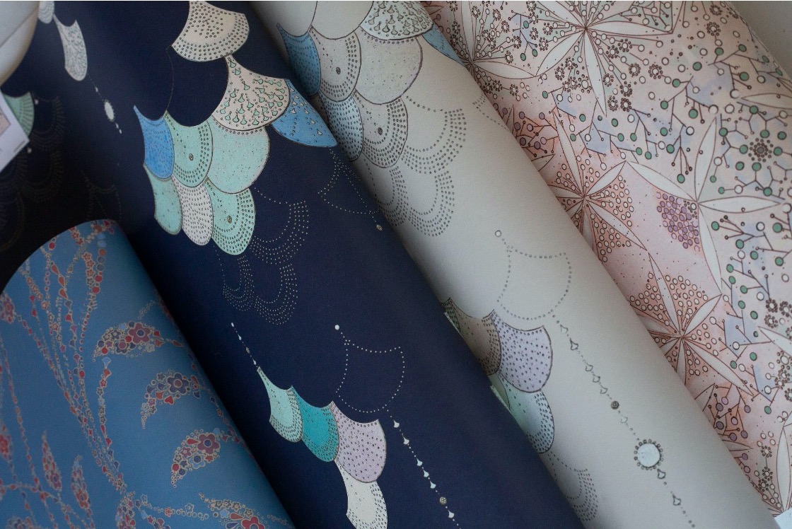 The mediums of patterns like Scale Balance and Beautiful Geometry range from ceramic bowls to fabric to wallpaper.