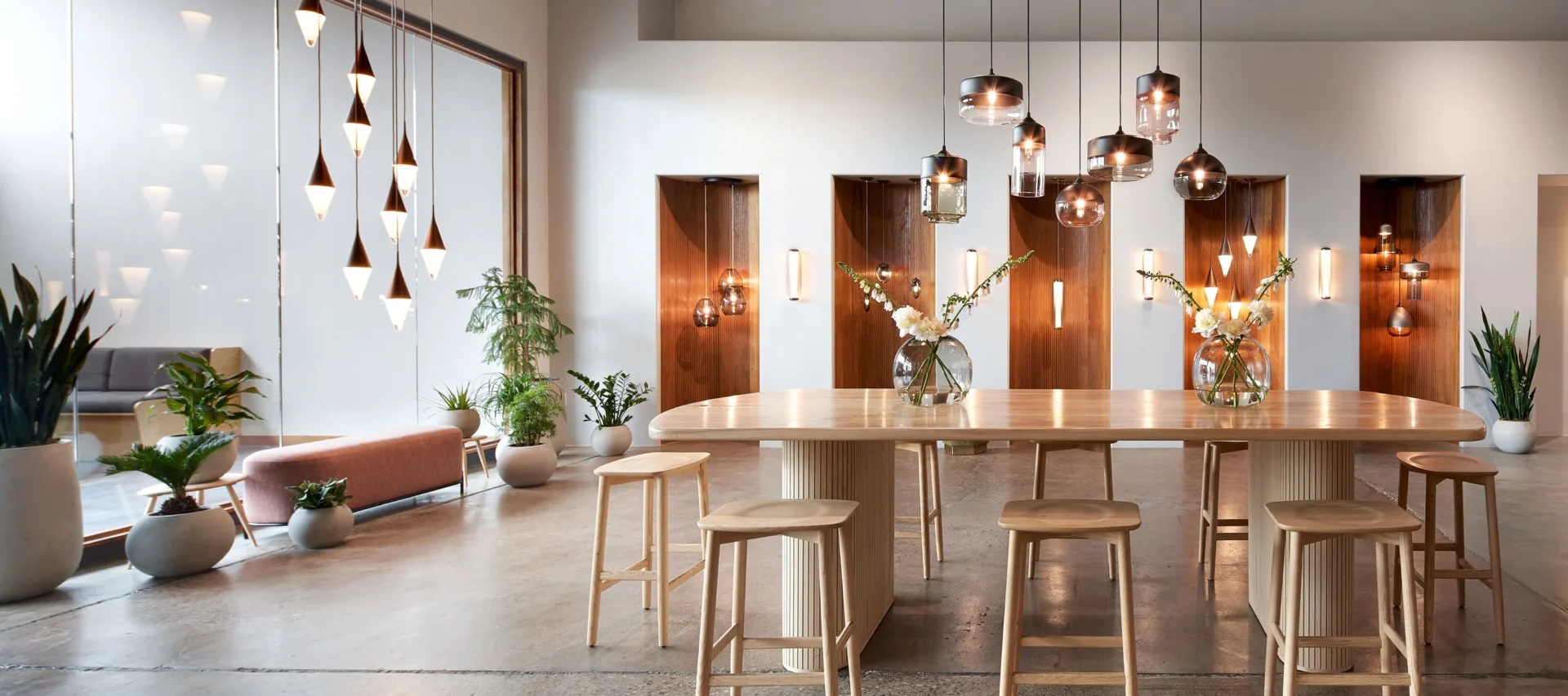 The Foliole Collection reimagines a leaf form, with a flattened shape that textures the glass and softly diffuses the light.