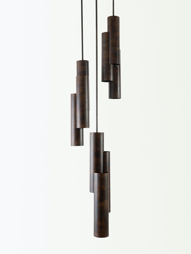 This chandelier reimagines a simple repeating cylindrical shape into a dynamic lighting fixture, perfect for an entryway.