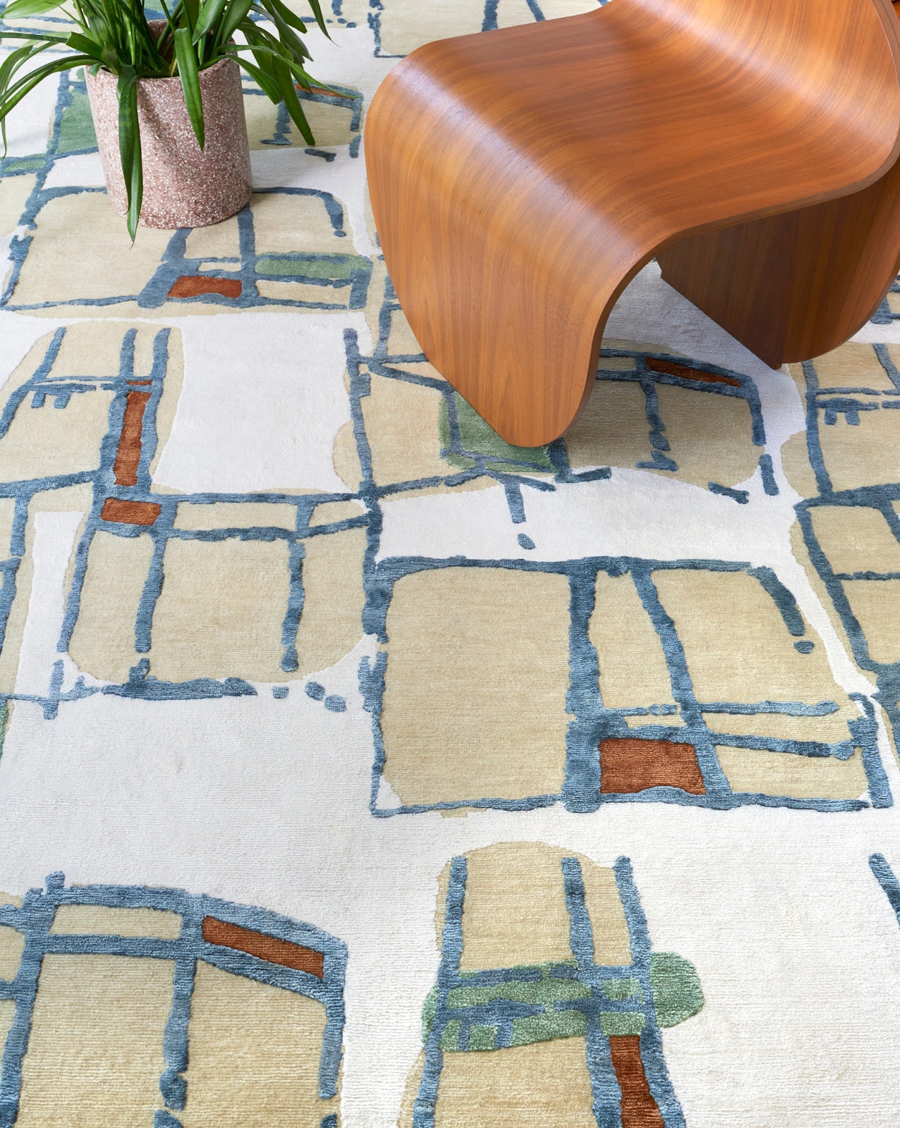 Eskayel’s innovative Quotidiana rug transforms apartment window views into an abstract, hand-knotted design in silk and wool, featuring rich hues like blue, rusty orange, and subtle green against a white and cream base.