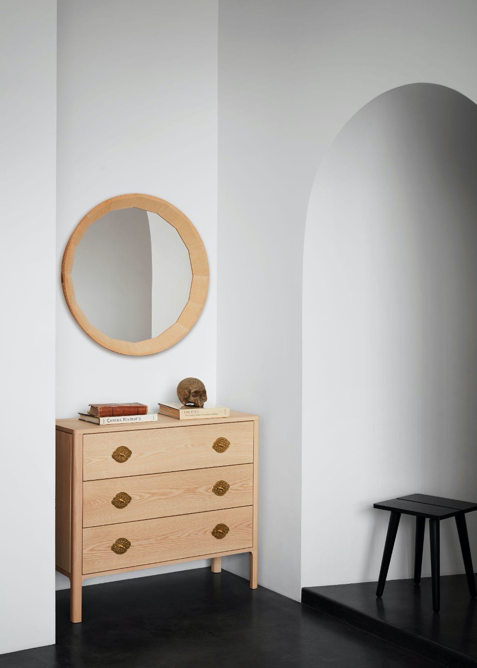 Kommode featuring Seitz’s finely carved wall mirror, with Stabellensthul tucked in the corner.