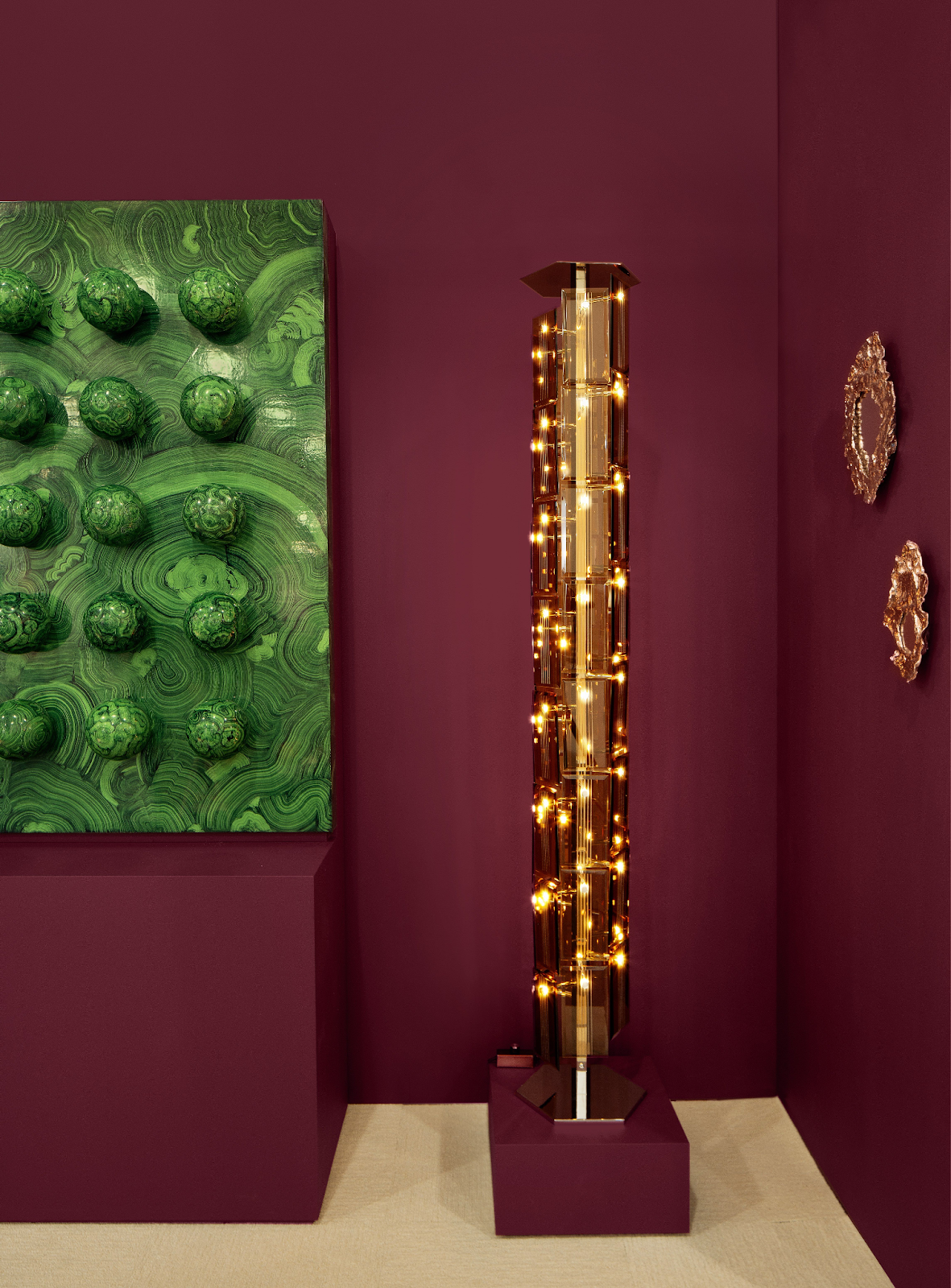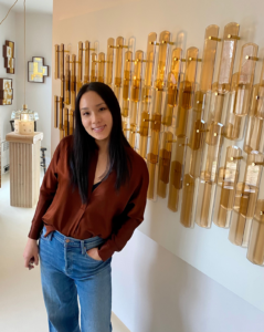 This year at ICFF, I debuted my Elica lamp, which I created using 1970s vintage amber glass from India. Its sister piece is a gilded vintage glass wall installation – “Resilience” – currently on view at Demuro Das.