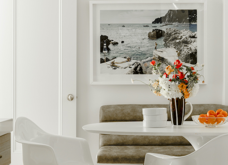 An original Marilyn Minter print serves as a visual anchor for this transitional-style entryway. The rich, warm tones in the home’s original parquet floor are echoed in a midcentury-inspired table. A glass bubble chandelier hangs above and catches the natural light from the nearby windows, overlooking 82nd St in Manhattan.