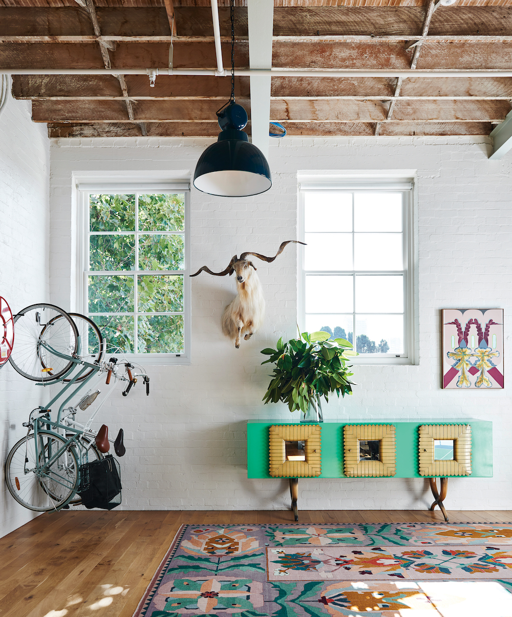 For all its industrial bona fides, Ola’s home is punctuated with highly personal touches. In the large entry foyer, a taxidermic Australian Cashmere goat leaps between two windows above a 1950s Italian sideboard. There’s a Mathieu Challières bird pendant hanging in daughter Ava’s bedroom, and on the wall – enlarged to Andreas Gursky proportions – a photograph of a child’s plush toy.