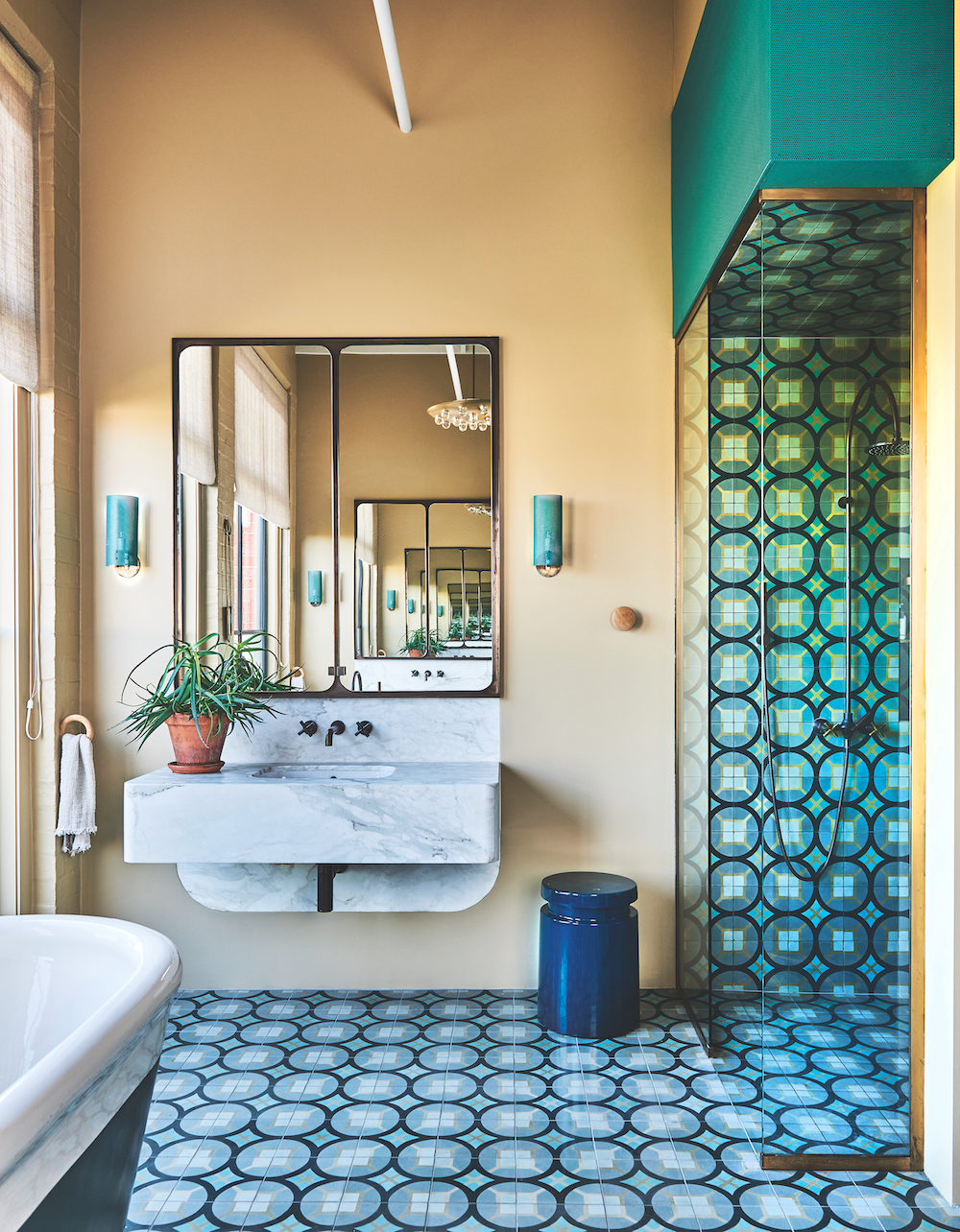 While embracing what she had, Ola did design a few site-specific additions, including large, tall steel-and-leather bookshelves for the family room, and in the kitchen, an expansive island with dedicated seating and steel sideboards topped with colorful concrete tiles. And while she maintained the industrial authenticity of the home, she mediated the existing spaces with an eye to light, flow and livability. She reduced the number of bedrooms from five to three, making each one more spacious; repositioned the kitchen to a more central location; and installed steel-framed glass divisions to better define interior spaces without sacrificing the penetration of natural light.