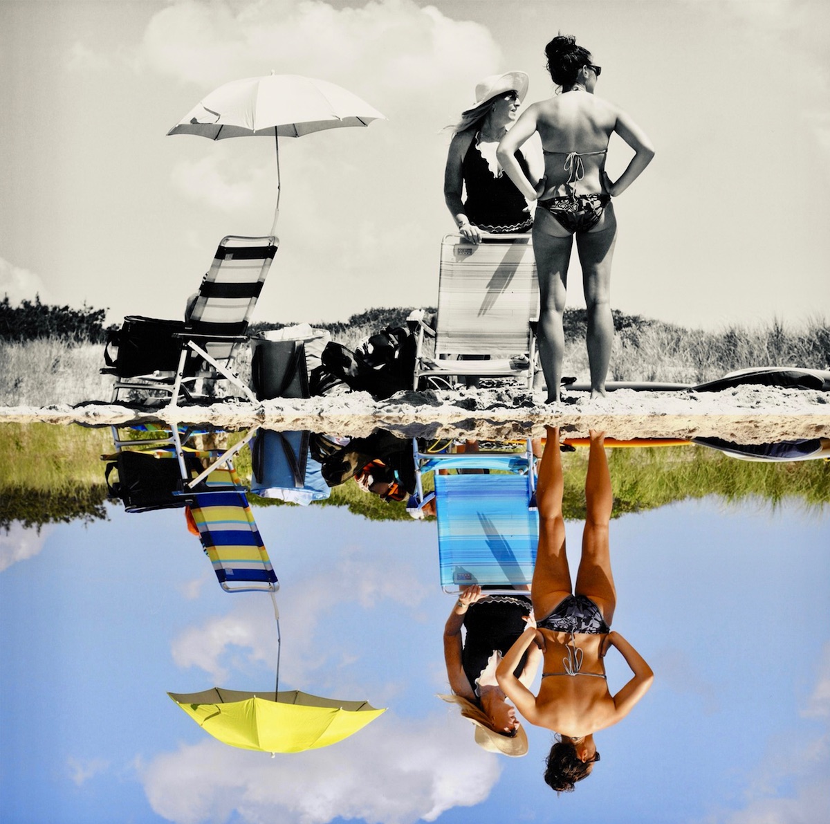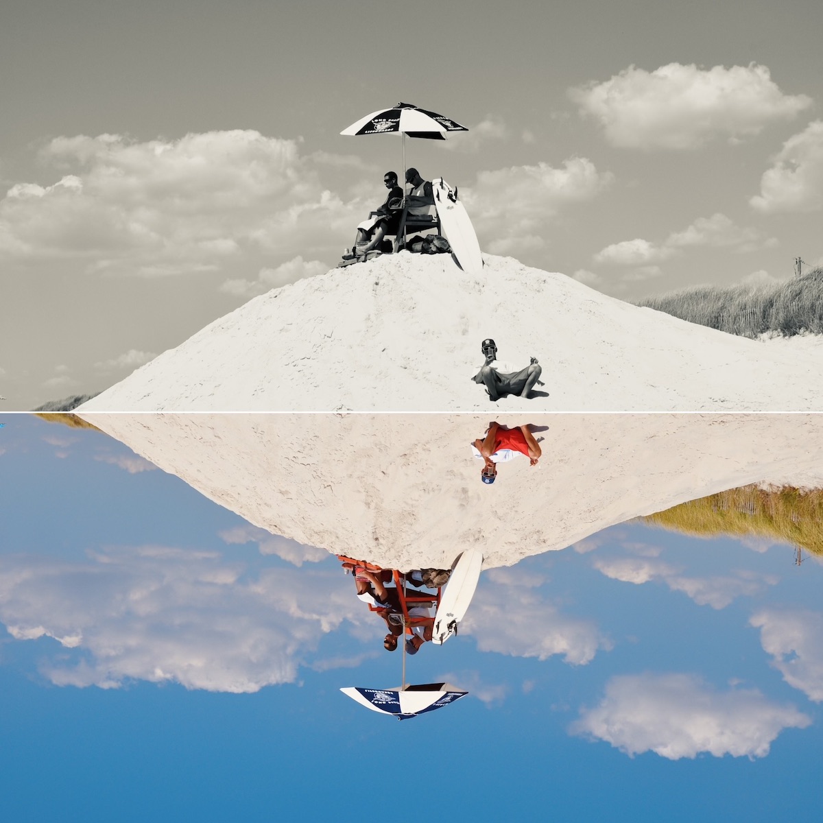 “In Sandmen, the juxtaposition of beachgoers above and their submerged reflections below serves as a visual representation of the duality of human existence, a concept rooted in Jungian philosophy. Drawing inspiration from Carl Jung’s Shadow persona concept and the realm of Quantum Physics, I delve into the profound influence these forces exert on human behavior.”