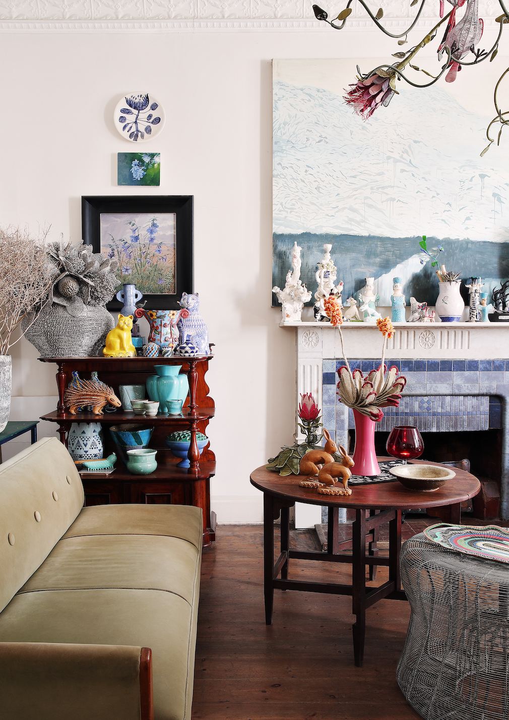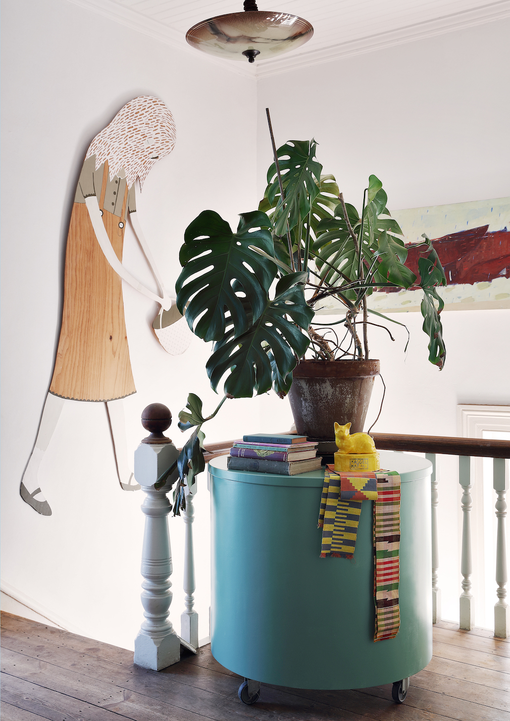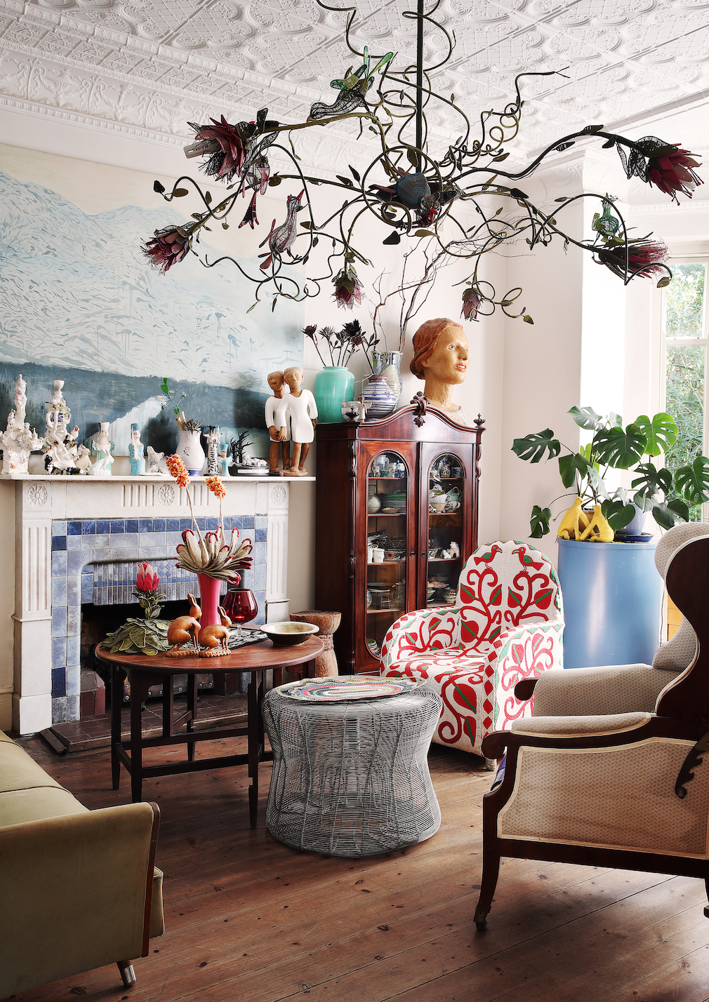 The characterful dwelling, a grande dame with its thick walls, voluminous spaces, restored sash windows that allow in tons of light and original detailing such as pressed ceilings, has proved to be the perfect foil for Woermann’s lifetime collection of (mainly) African art, craft, found ephemera and pieces she has made herself. And while each room is quite different, each is defined and therefore connected by her talent for assembly and display. “It feels a bit odd to me when people use the word ‘curated’ for how the house looks,” says Woermann. “Really, I think it’s quite haphazard,” she laughs. “It’s just evolved and become fuller the longer I’ve lived here.”