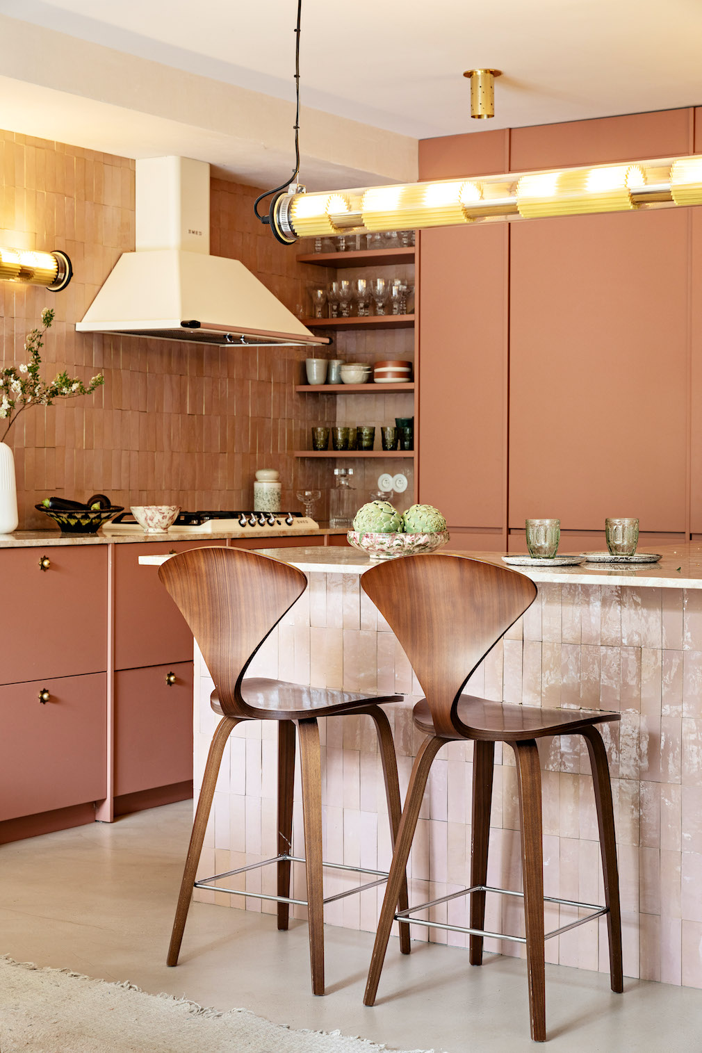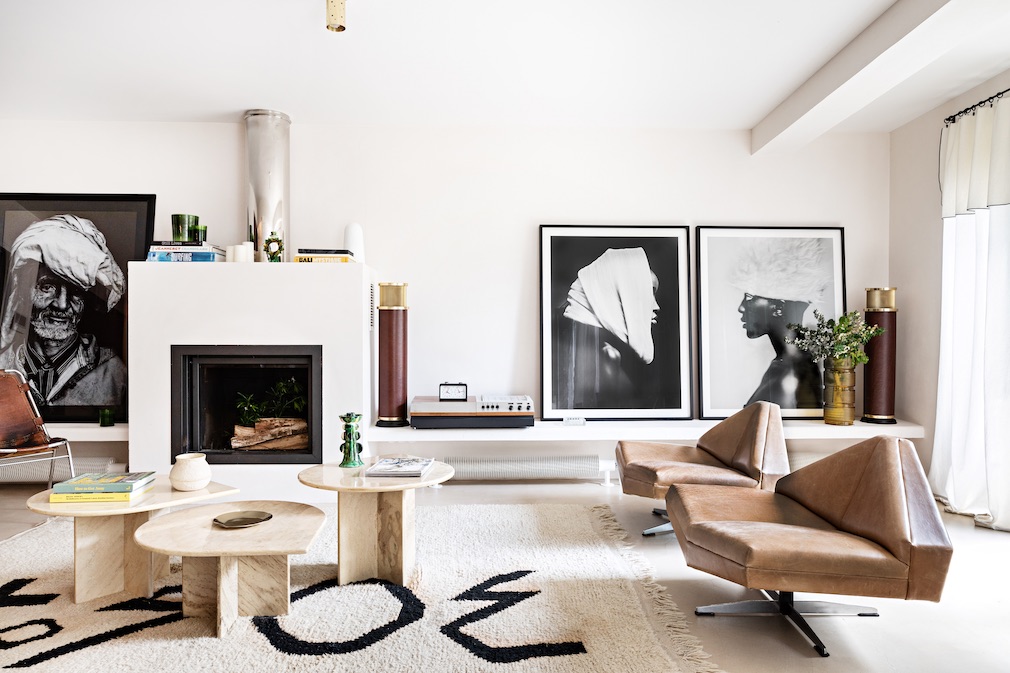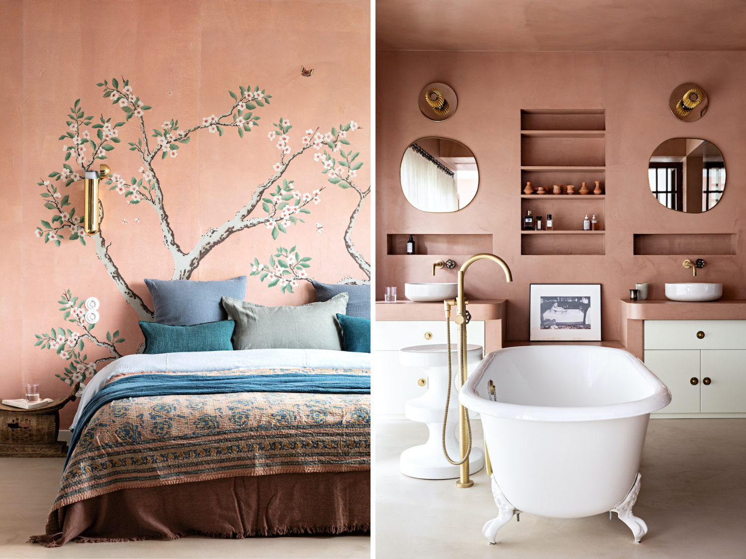 Upon entry, you’re greeted by Uzeel’s signature color: pink. “It’s a soothing color that transports me,” she shares. From the polished concrete of the kitchen to the custom wallpaper in the primary suite, pink reigns supreme. It’s not the saccharine hue one has grown to expect, but rather a nuanced palette balanced by dark wood carpentry and bold vintage pieces. A passionate advocate for secondhand treasures, Uzeel sourced many of her home’s furnishings from the legendary Saint-Ouen flea market. Iconic finds like the De Sede Terrazza sofa and a Saarinen table lend a sense of timeless character to her interiors. “Vintage items bring soul to a space – the little twists that make all the difference,” she muses. Whether it’s a pair of leather armchairs or the mural behind her bed created by a painter friend, the interior fabric of this home is deeply personal with a story at every touch.