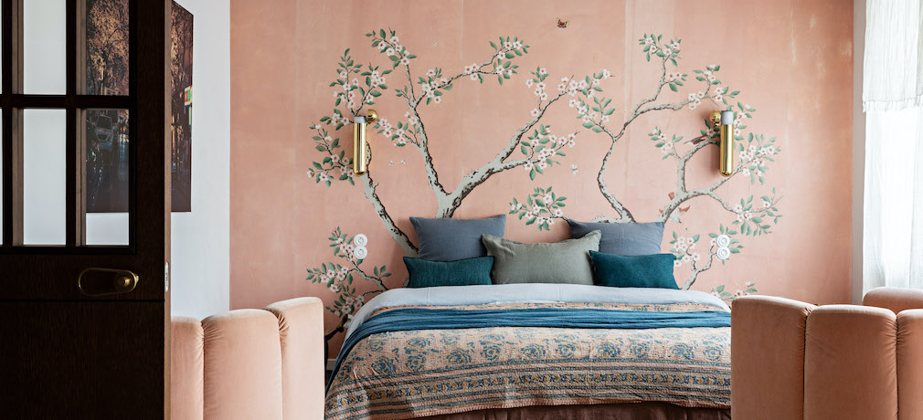 Upon entry, you’re greeted by Uzeel’s signature color: pink. “It’s a soothing color that transports me,” she shares. From the polished concrete of the kitchen to the custom wallpaper in the primary suite, pink reigns supreme. It’s not the saccharine hue one has grown to expect, but rather a nuanced palette balanced by dark wood carpentry and bold vintage pieces. A passionate advocate for secondhand treasures, Uzeel sourced many of her home’s furnishings from the legendary Saint-Ouen flea market. Iconic finds like the De Sede Terrazza sofa and a Saarinen table lend a sense of timeless character to her interiors. “Vintage items bring soul to a space – the little twists that make all the difference,” she muses. Whether it’s a pair of leather armchairs or the mural behind her bed created by a painter friend, the interior fabric of this home is deeply personal with a story at every touch.