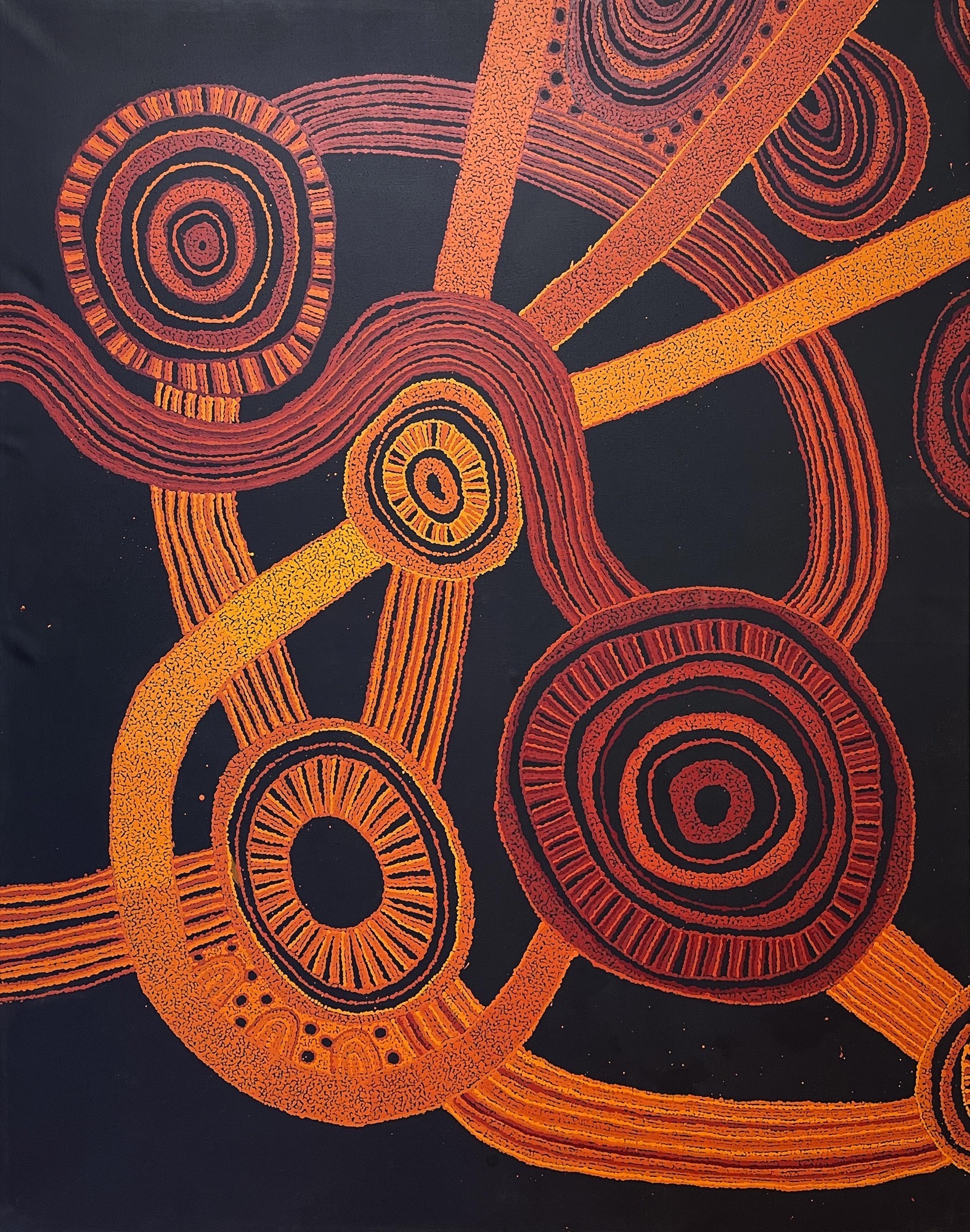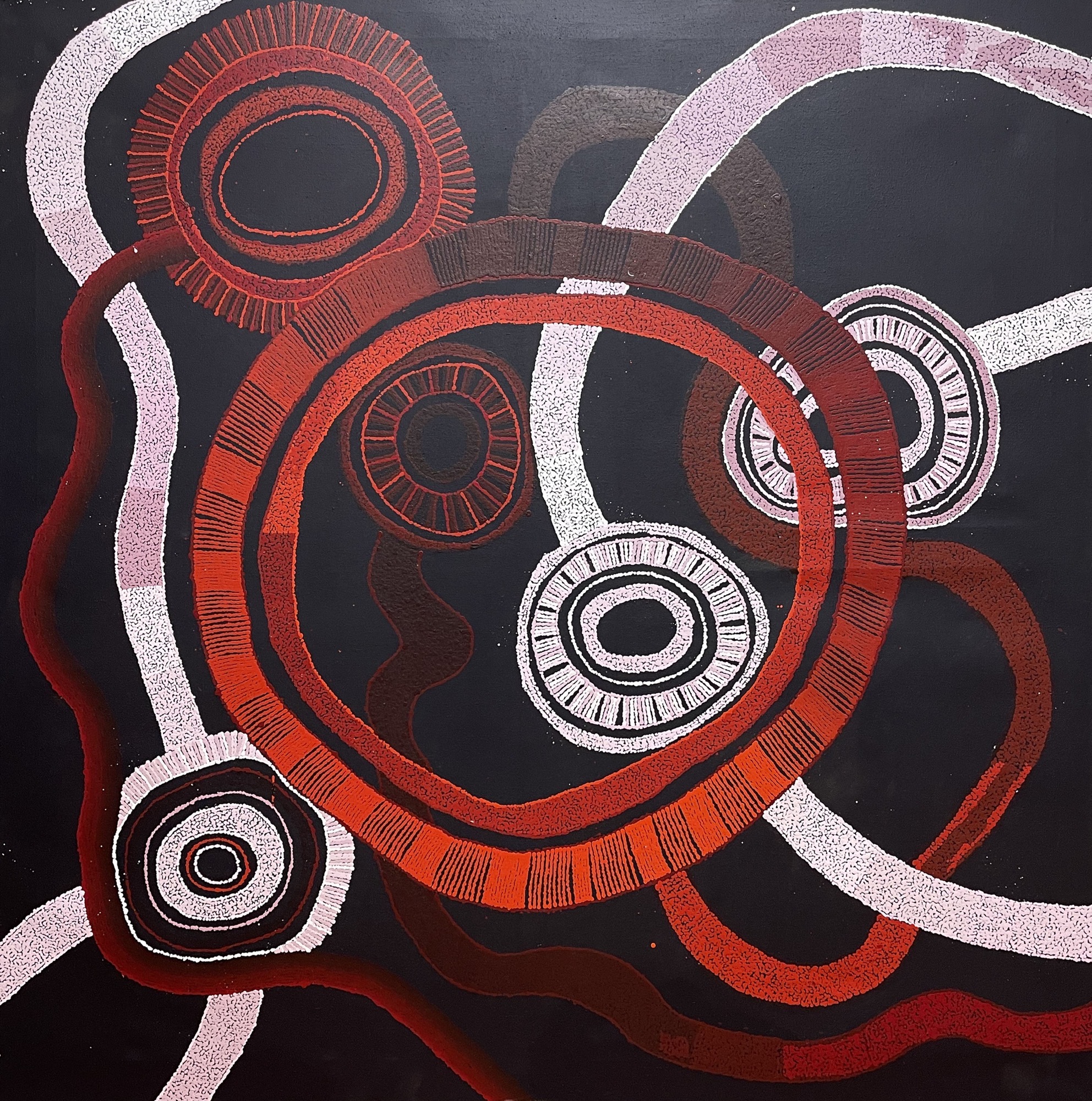 “My paintings are both literal maps of the landscape and objects of meaning removed from any physical representation,” Brown explains. “Though not always depicted, the importance of Antara is never lost in my work. The site has been integral to the existence of Anangu culture since the beginning of time. Today my life is different to that of my ancestors and my work is a tool to document my part in a story that spreads across timespans bigger than our imagination.”