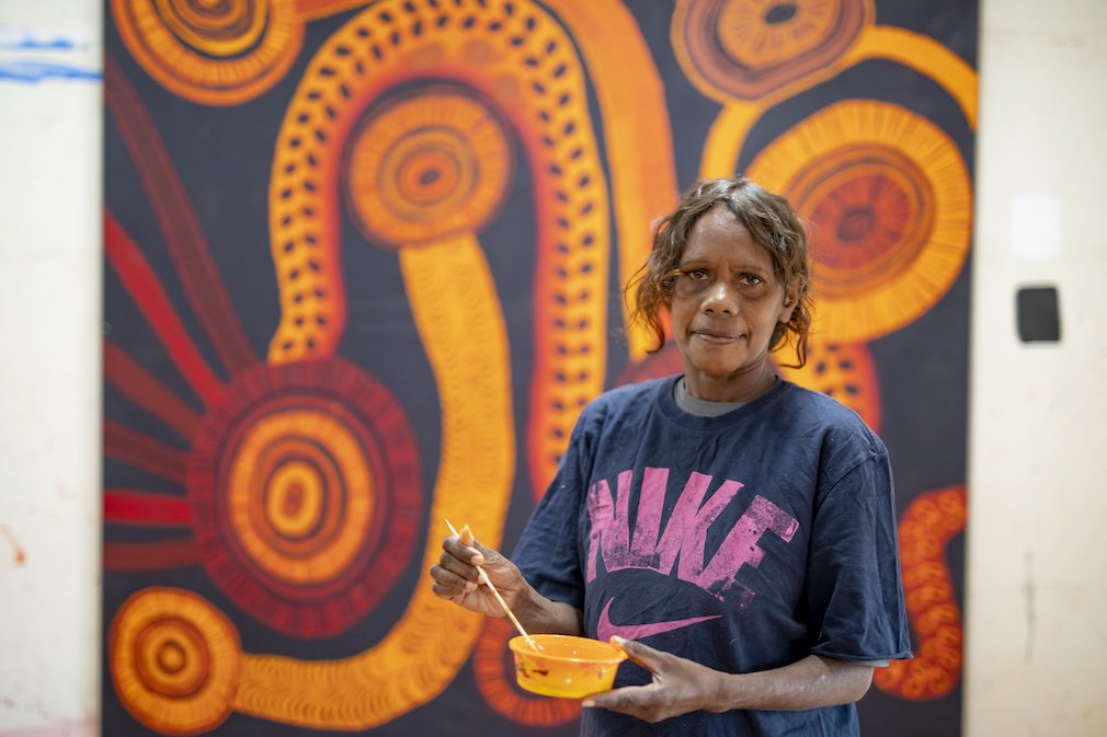 In her art practice, Brown shows contemporary ways of seeing her ancestral knowledge, sharing insights into her experience of day-to-day community life. Brown often spends the weekends out on country with her mother and daughter, collecting minkulpa (bush tobacco), maku (witchetty grubs) and care for the local tjukula (rock holes). Particularly after kapi pulka (big rains), the land becomes so fertile, that they harvest bush foods like the gnurru (lollie tree) and camp out on country like the old people used to.