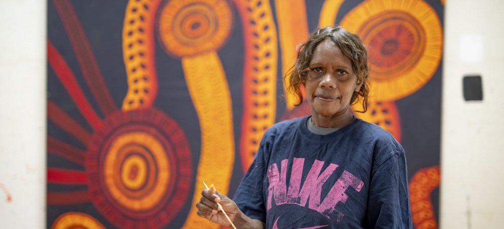 In her art practice, Brown shows contemporary ways of seeing her ancestral knowledge, sharing insights into her experience of day-to-day community life. Brown often spends the weekends out on country with her mother and daughter, collecting minkulpa (bush tobacco), maku (witchetty grubs) and care for the local tjukula (rock holes). Particularly after kapi pulka (big rains), the land becomes so fertile, that they harvest bush foods like the gnurru (lollie tree) and camp out on country like the old people used to.