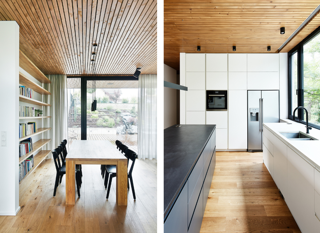 Prioritizing comfort, the L-shaped house is adjoined on the east by a smaller building with a sauna and relaxation area at terrace level and a large garage with a workshop and storage on the floor above, which is connected to the level of the access road. An access staircase runs alongside the garage under a light transparent pergola so that the residents can continue to the exterior after arrival, but with dry feet to the actual entrance to the house one floor below.