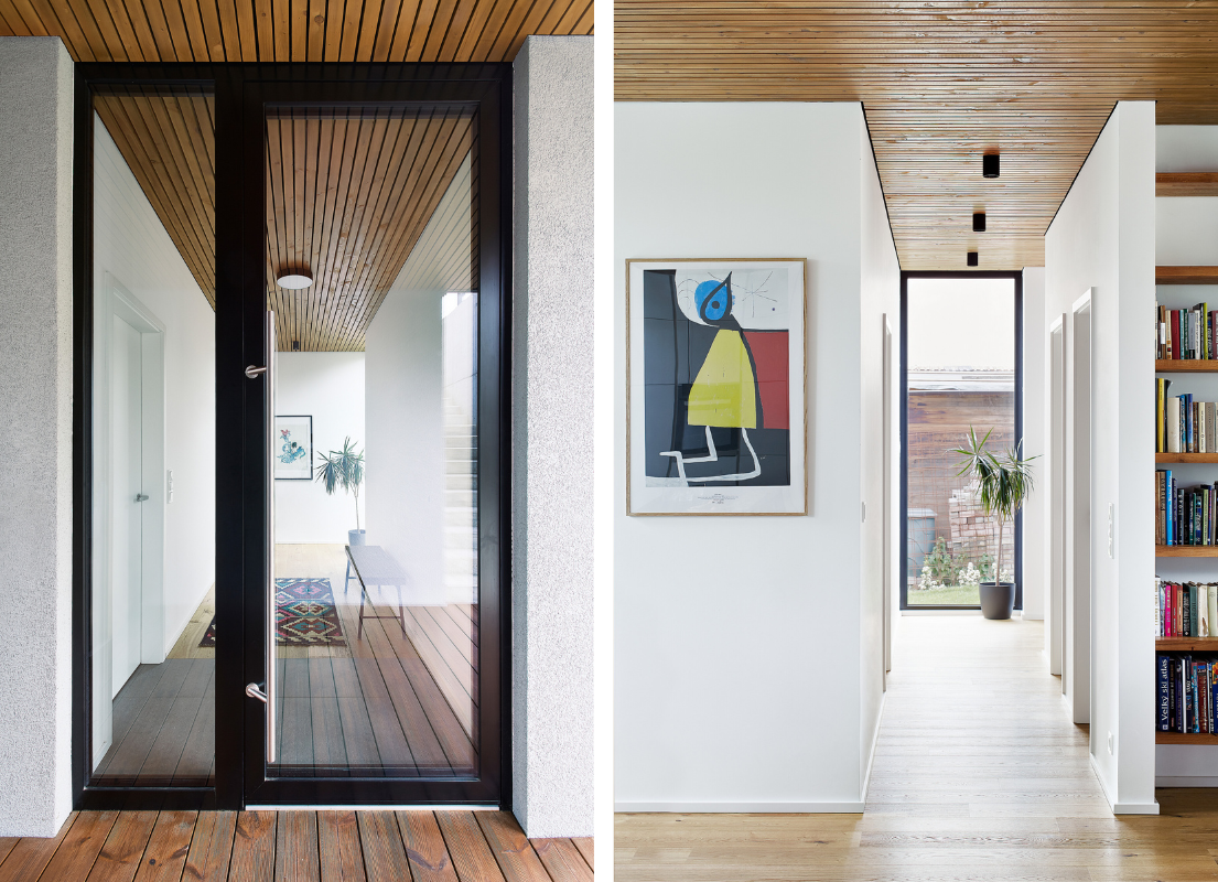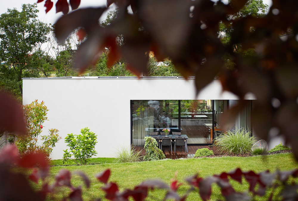 The western part of the house operates as a private zone. The bedrooms have windows oriented to the side towards the more distant neighbor. At the opposite end of the house, facing the closest neighbor, is the entrance area and an office with a window facing north onto the green. When viewed from the street, only the driveway to the garage is visible to passers-by and then a long strip of greenery, which protects the residence terrace and the building on the lower level from views from the street – the house is thus essentially hidden from the eyes of the outside world.