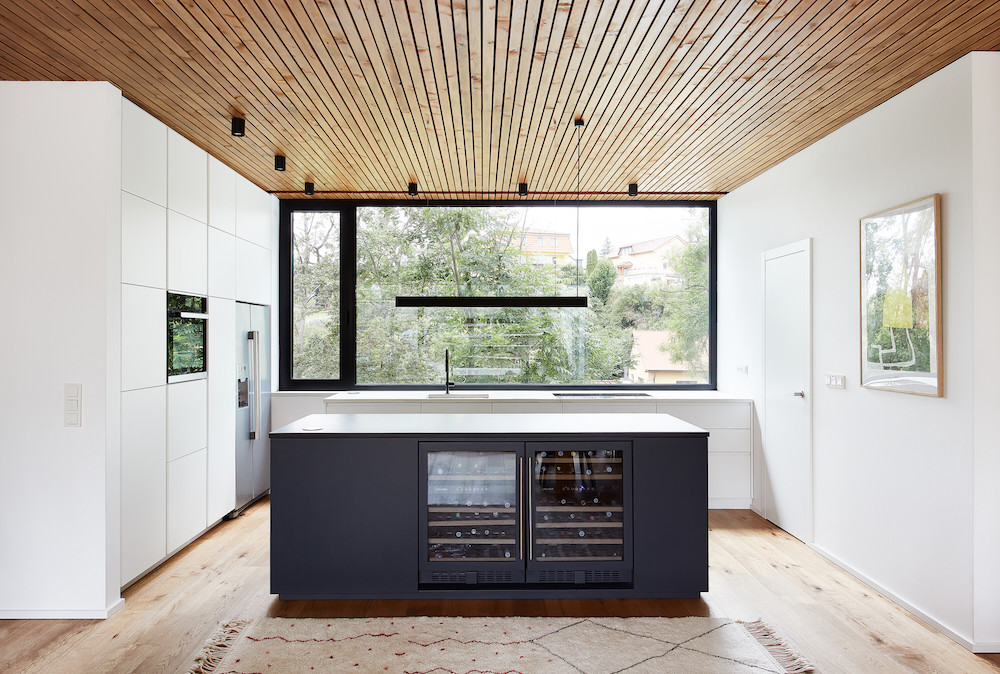 The main living area, thanks to a large glass wall, is directly connected to the terrace and imaginatively extends into the garden. On the north side there is a kitchen with a long window that allows a view through the full width of the house to the green on the north side.