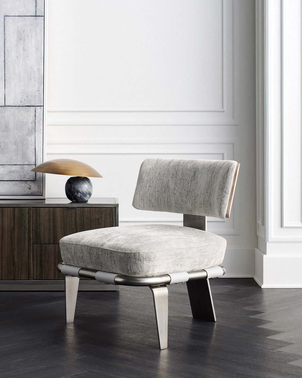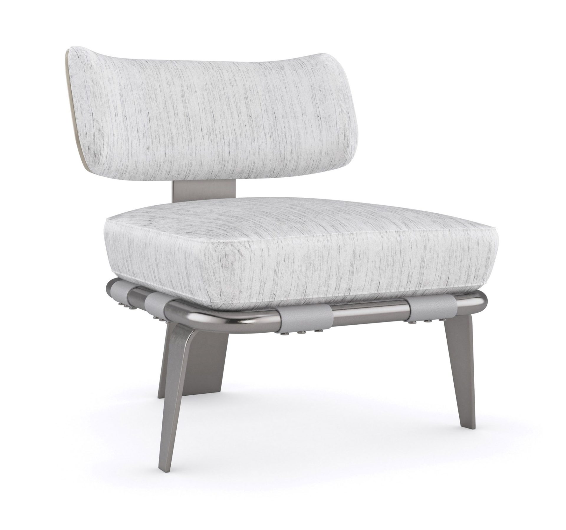Our take on the classic Klismos style is reimagined in a fresh mix of materials and finishes. A fusion of wood, metal, and leather lends a contemporary light look in silver textured velvet. Adding visual interest and tactile intrigue: a pale gray leather strap supporting the seat and a winged outer back in fumed figured eucalyptus, exquisitely finished in Smoked Stainless Steel paint.