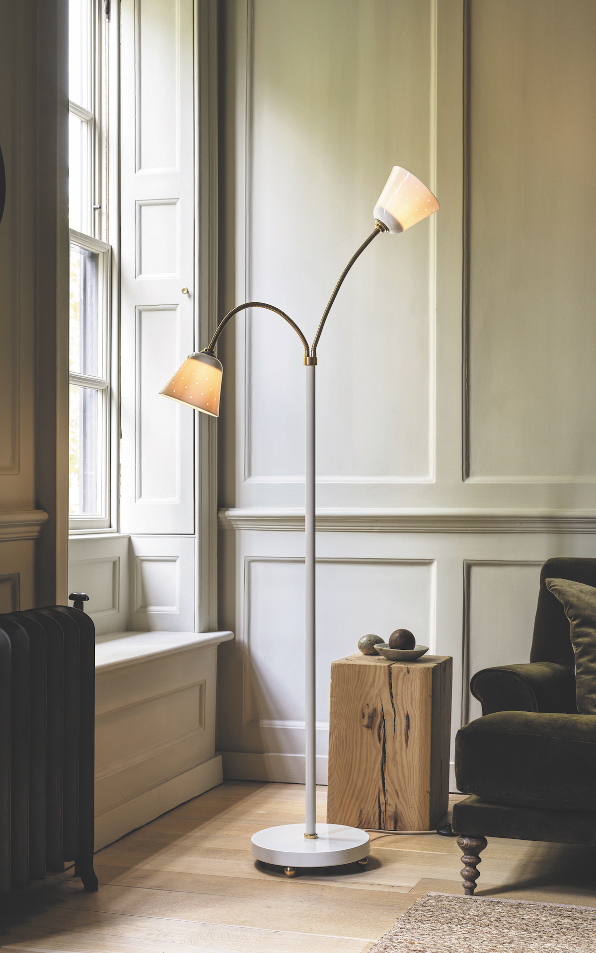 The dashing Alma floor light was developed in partnership with interior designer Beata Heuman. The collection, inspired by Scandinavian midcentury style, also includes a wall light and pendant, and comes in natural white (pictured), coral and seaweed green.
