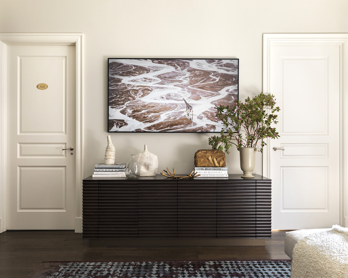 Fluted on all sides with mitered doors, sides and top, this walnut console by Donna Mondi and crafted by New Style, is an engineering marvel, accommodating the thickness for the doors, and aligning all elements so that no edges were visible from the top and front. The result is a unique console that doesn’t compromise functionality or style.