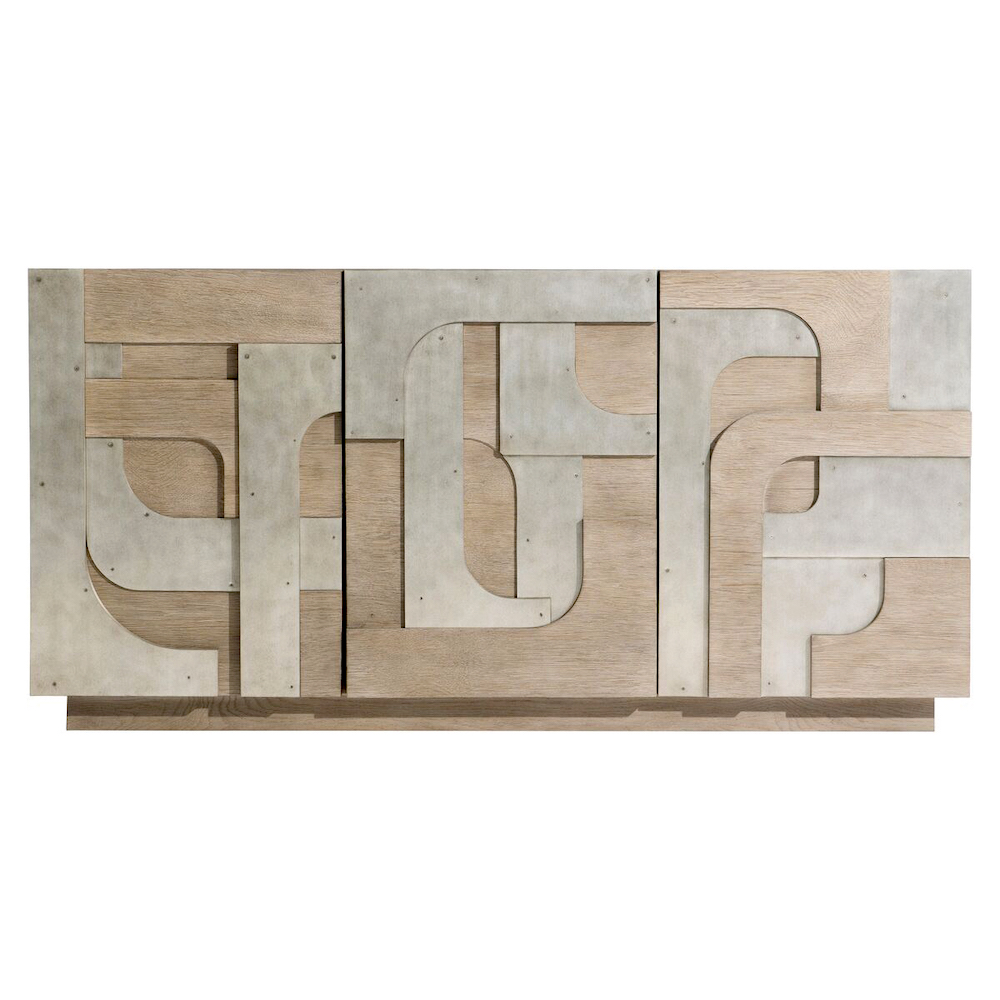 A modern mix of oak veneers, solid oak, and cast aluminum create the dimensional, geometric lines of the Azlin Buffet from Bernhardt Interiors. Through J. Marshall Design.