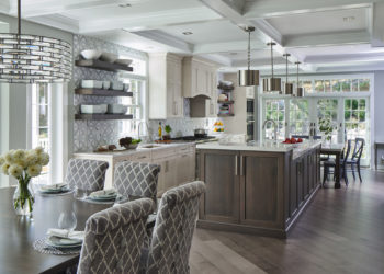 In this kitchen designed by Paula Greer, CKD and Senior Designer at Bilotta Kitchen & Home, wooden cabinets painted in Farrow & Ball’s Light Blue bring a sense of serenity to a busy space.