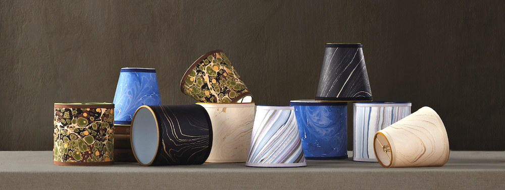A new line of chandelier shades debuted in the fall. Including six Indian block-printed patterns, three grasscloth and five in marbled paper, these new shades will quickly transform a light fixture’s vibe, seasonally or even permanently.