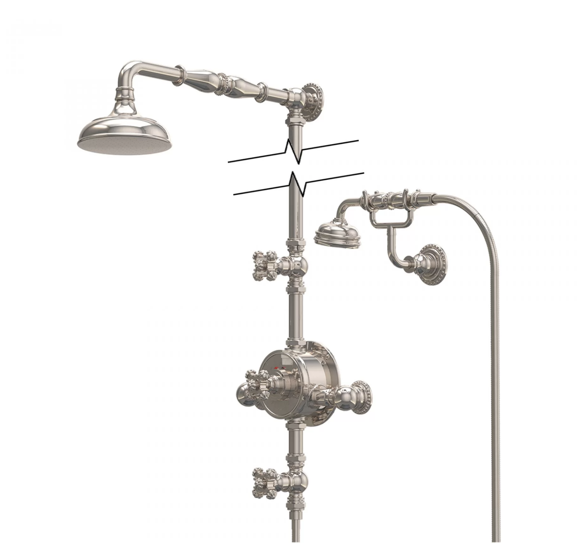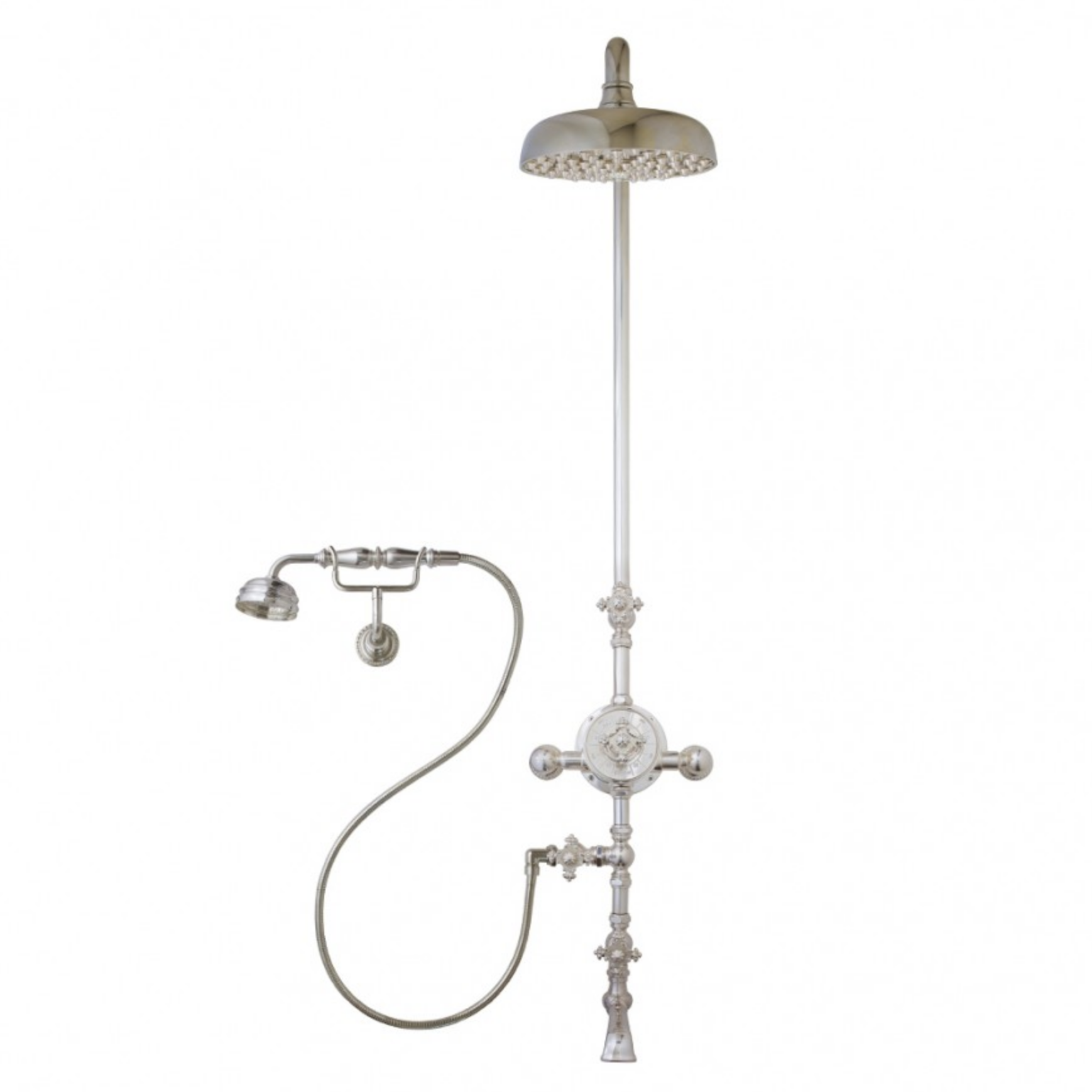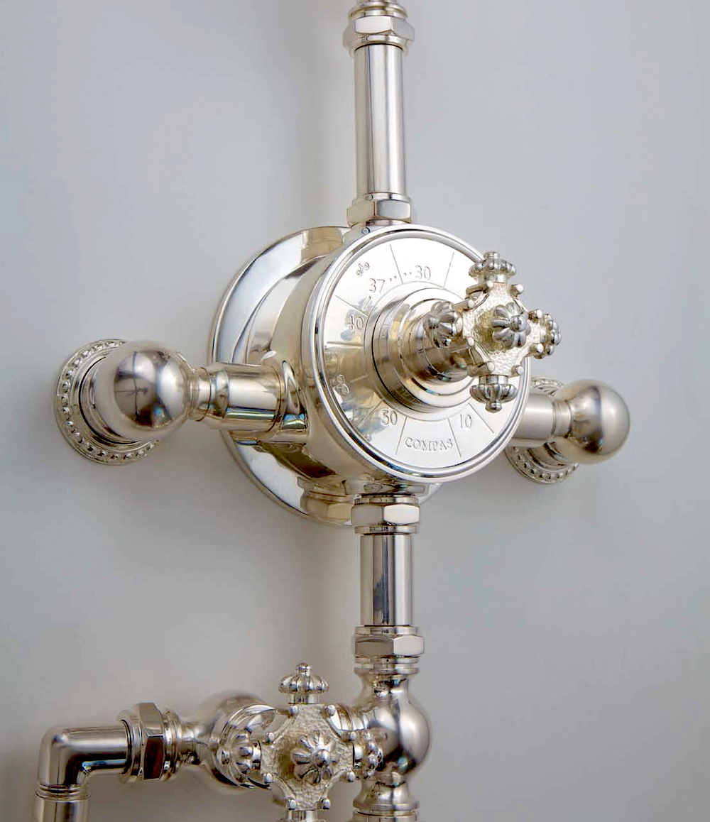 Handcrafted in France, the Cruciform External shower system, shown here in a genuine Sterling Silver finish, is seemingly traditional in style, while exceeding modern day performances. Its iconic design creates highly decorative jewel-like shower fixtures.